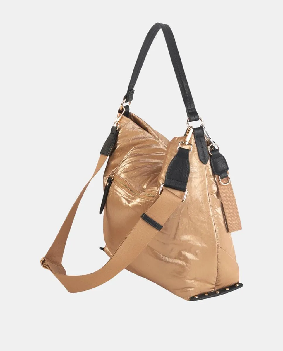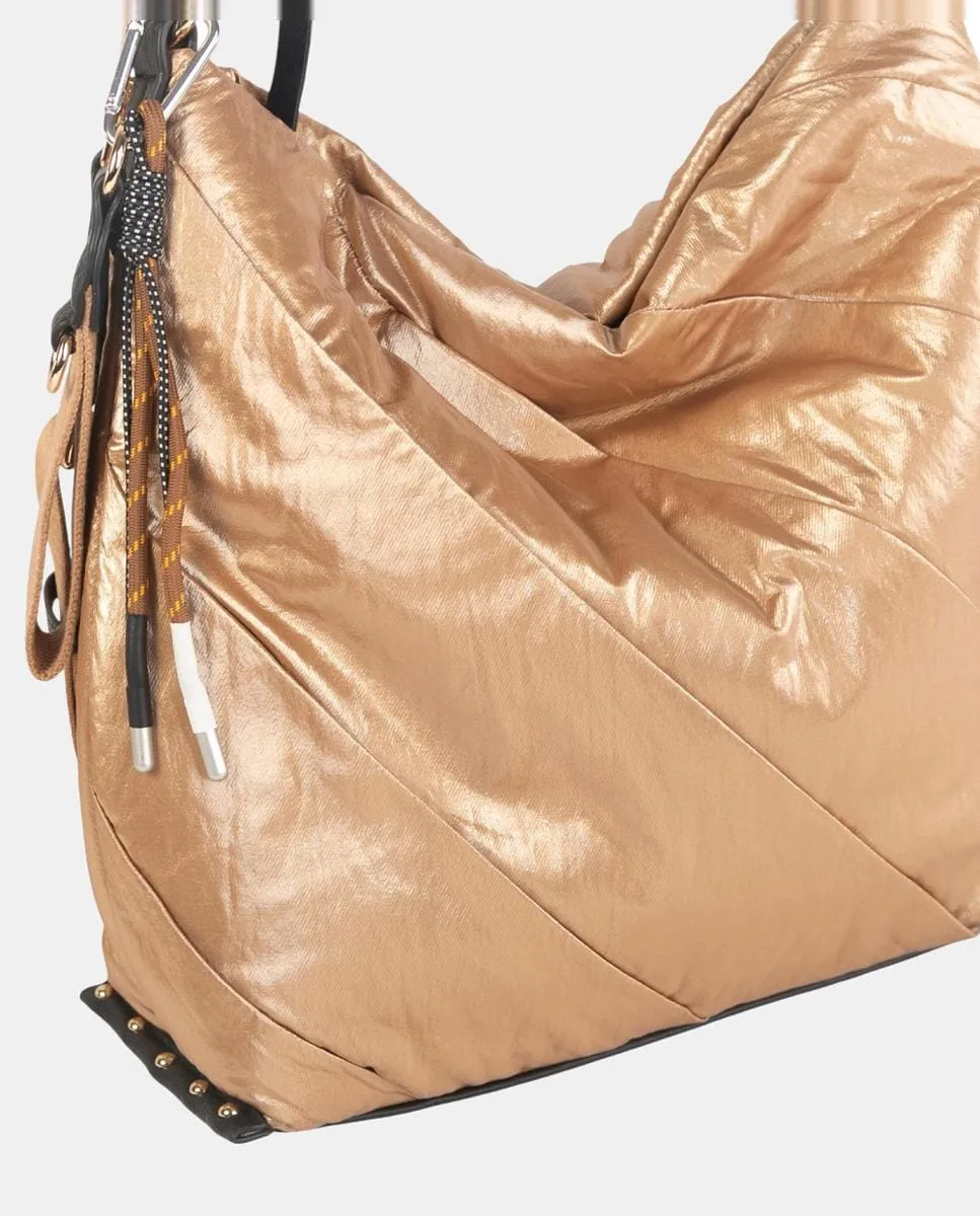 Сумка через плечо в стиле хобо, изготовленная из металлического нейлона золотого цвета и комбинированная с черным ПУ. Эта особая коллекция отличается отделкой спереди, выполненной в диагональных складках, придающих объем и индивидуальность. Боки с поддержкой из черного ПУ с заклепками добавляют молодежный акцент в коллекцию. Кисть состоит из карабина альпиниста и шнуров различных оттенков, а также комбинированной с ПУ ленты, придающей спортивный акцент в трендах. Эта модель включает дополнительную ручку на плечо из ленты и металлическую застежку-молнию на задней стороне.