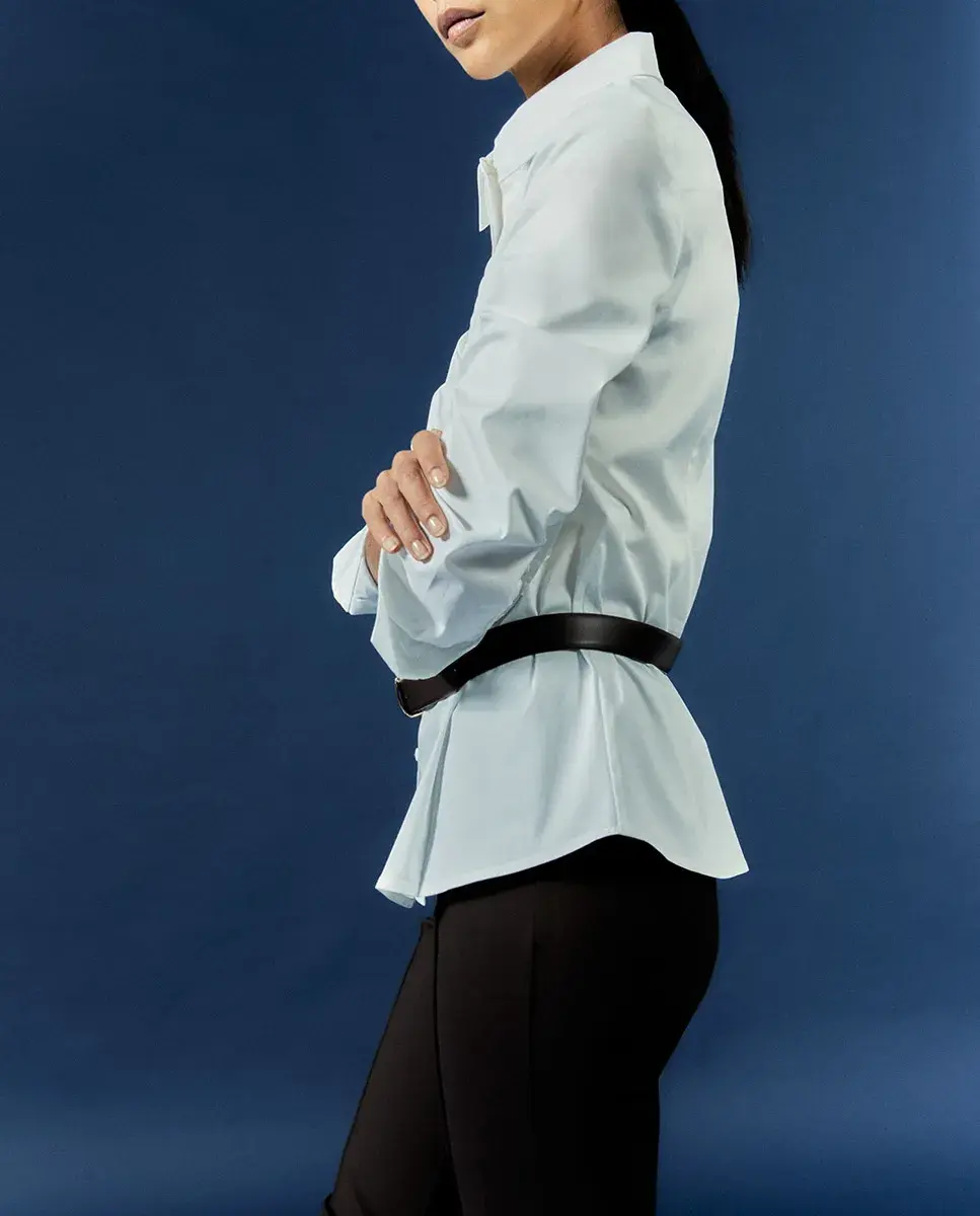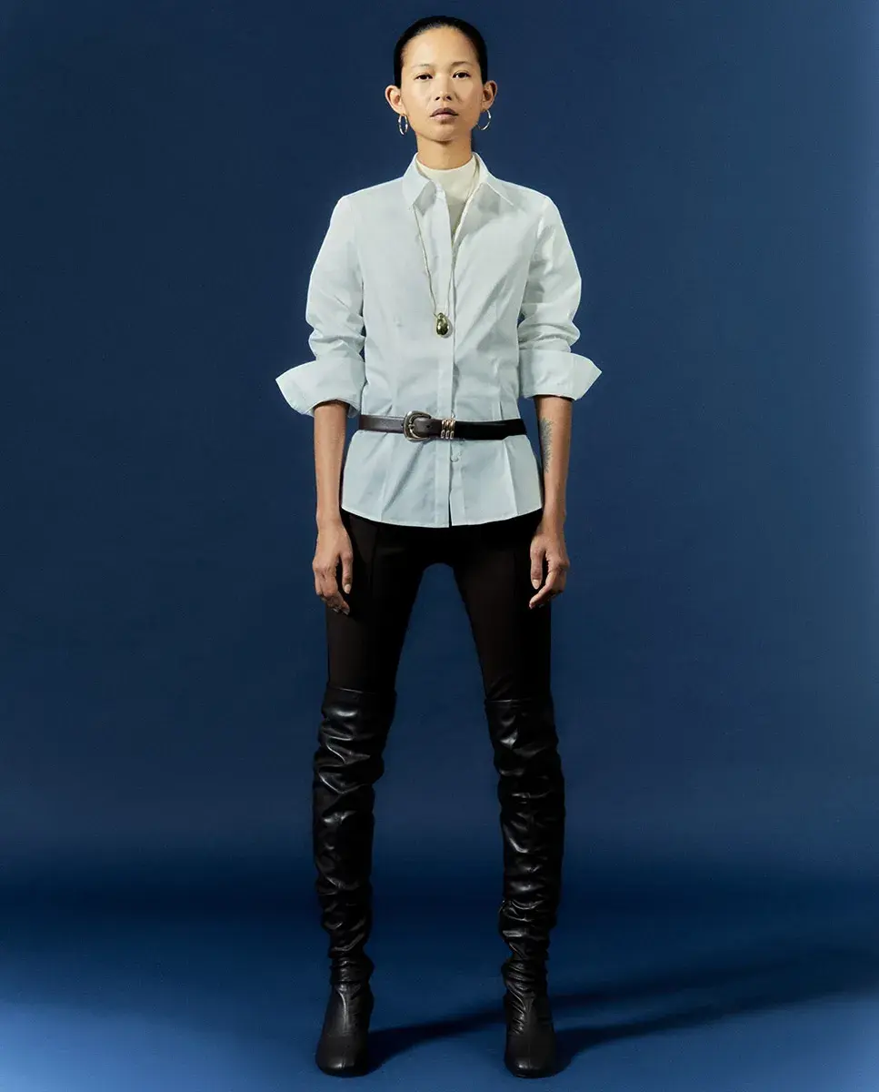 С slim-рукавом и воротником. Переднее застежка на простую пуговицу.