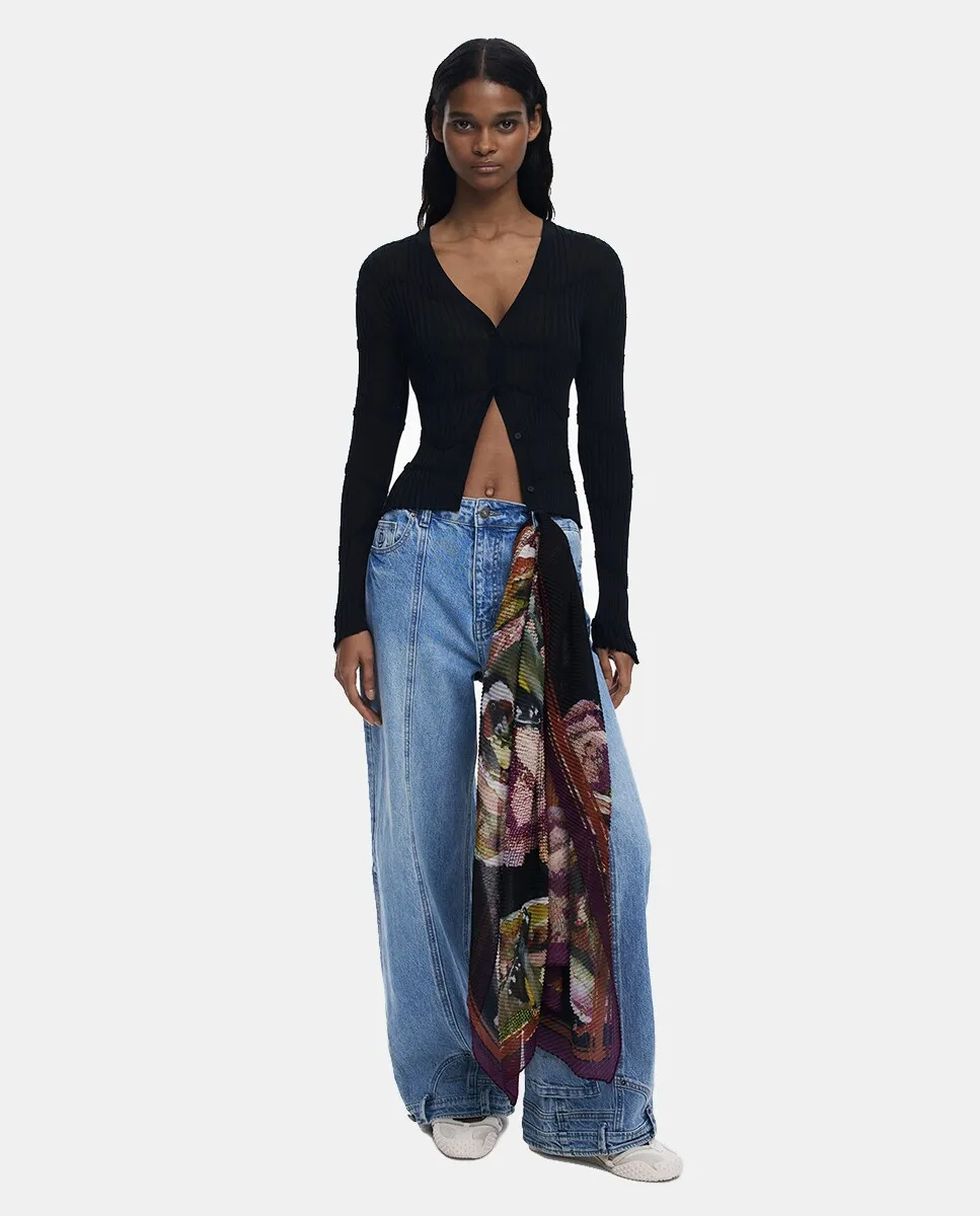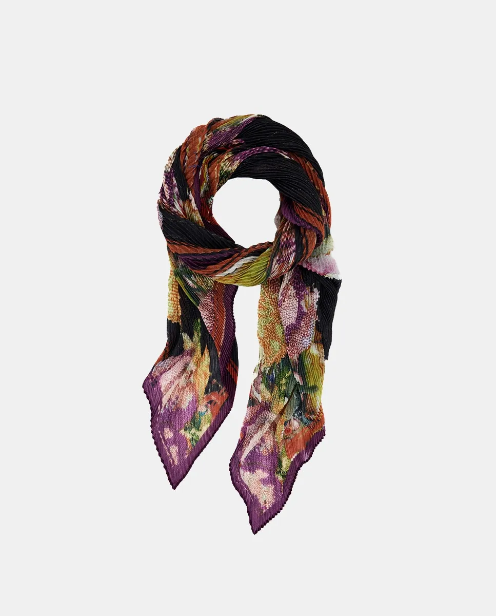 Большой прямоугольный платок с плиссированной тканью и принтом цветов и птиц, разработанный Месье Кристианом Лакруа.