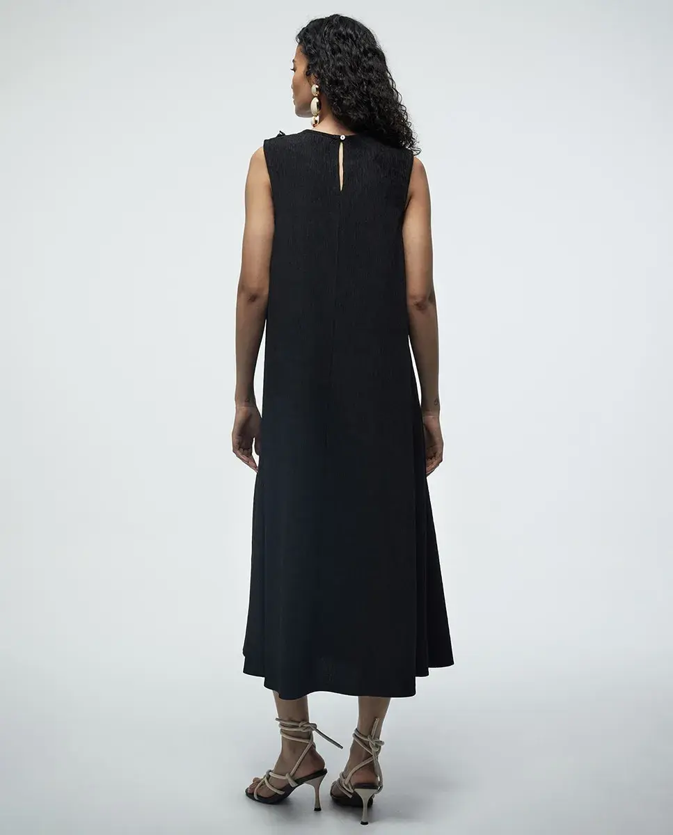 Длинное простое платье с безрукавками и круглым вырезом. Декор с короткими кисточками. Задний замок с каплевидным вырезом и пуговицей.