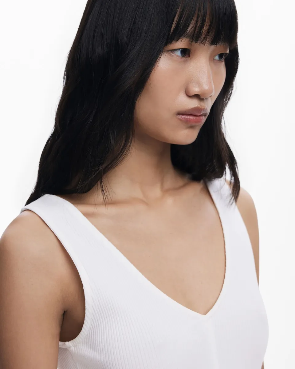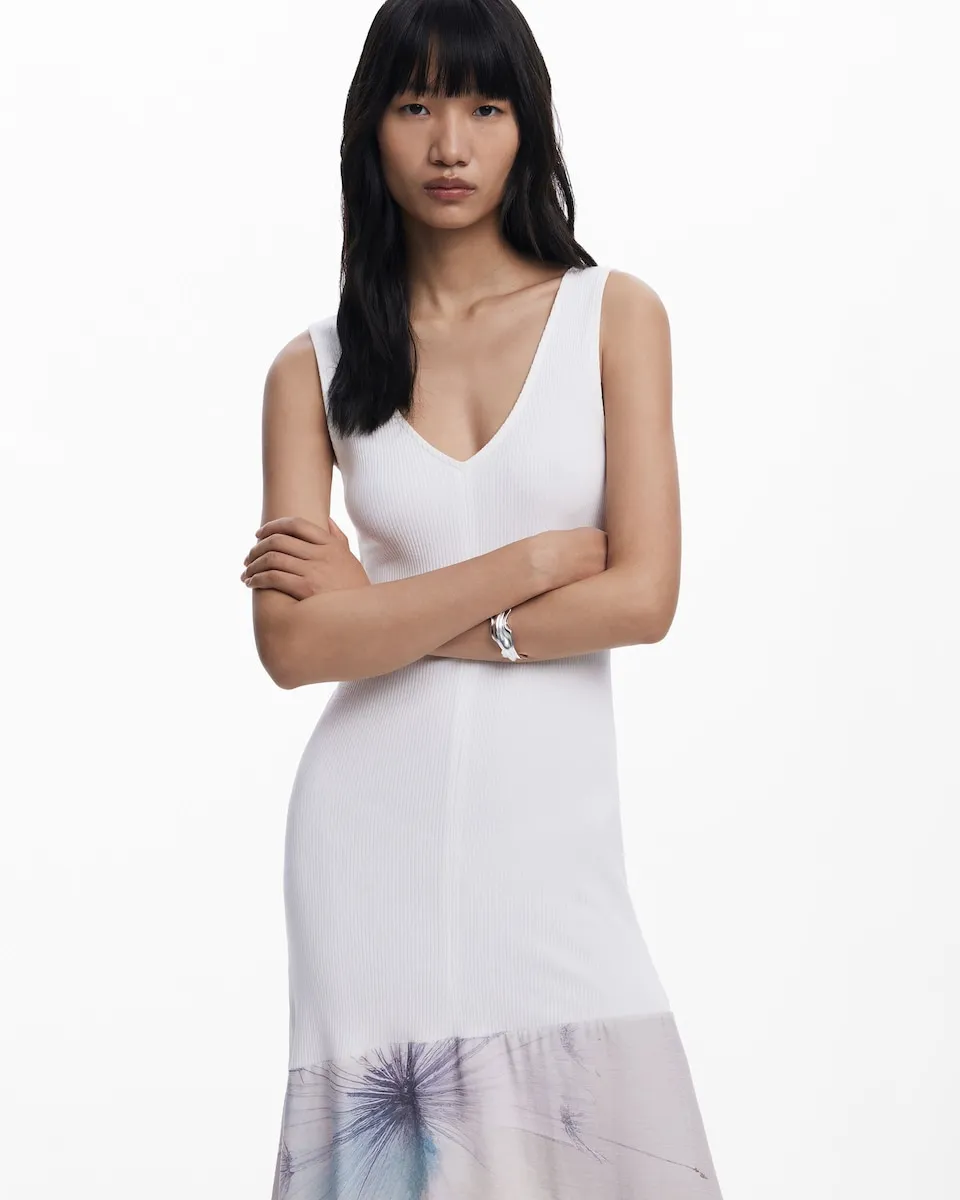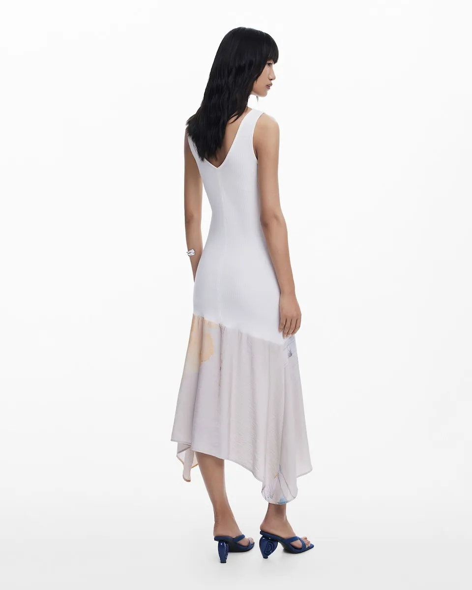 Короткое платье с комбинированной юбкой, без рукавов, с V-образным вырезом, однотонное и с асимметричным подолом, украшенное акварельными цветами. Принт Arty. Крой: Slim. Без рукавов. Длина: миди. Асимметричный подол. При покупке продукции из хлопка от Desigual вы поддерживаете наши инвестиции в Better Cotton. Этот продукт производится по системе массового баланса и может не содержать Better Cotton. bettercotton.org/massbalance..