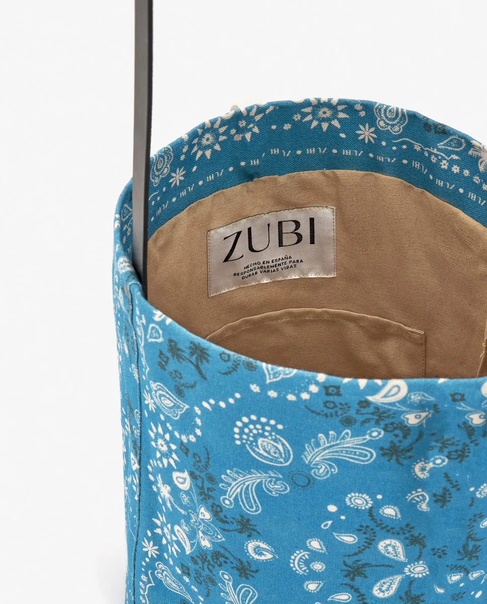 Новая кубическая сумка ZUBI выполнена из хлопкового материала с печатью в стиле пейсли, цилиндрической формы с длинной ручкой через плечо из черной кожи и закрывается с помощью хлопкового шнура, чтобы завязать узел.