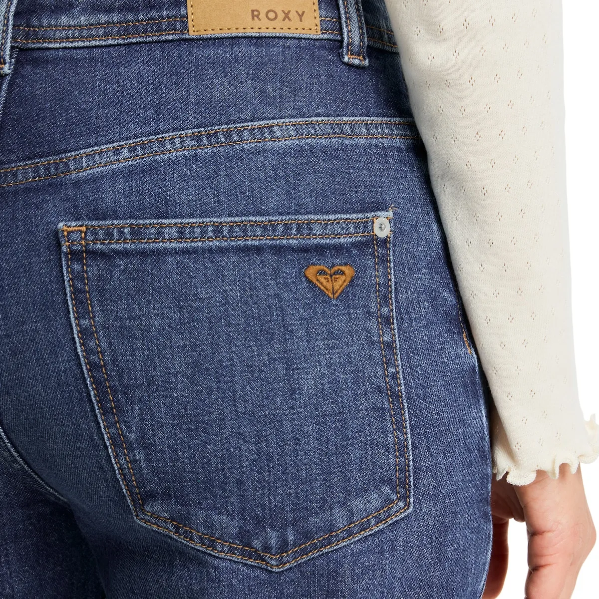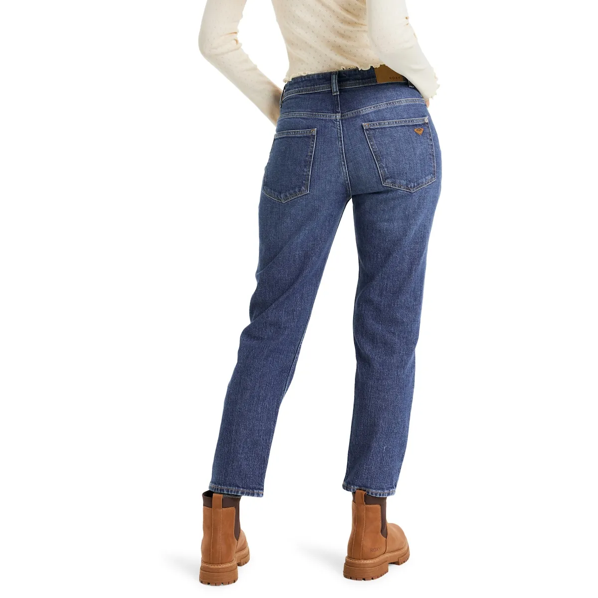 Прямые джинсы для женщин. Особенности: Материал: стирка джинсовой ткани и эластичная, Крой: прямой крой, длина до щиколотки, Застежка/Талия: средняя посадка, Детали: передняя часть талии с металлической кнопкой Roxy, застежка с скрытыми металлическими пуговицами, деталь с металлическими заклепками и пять карманов.