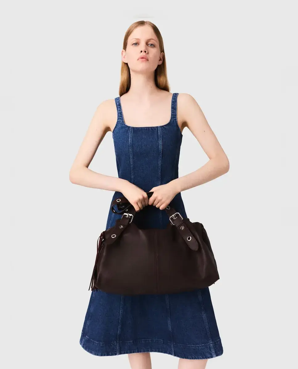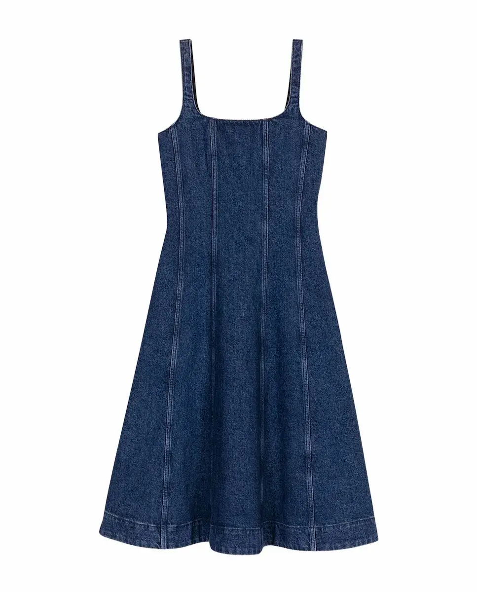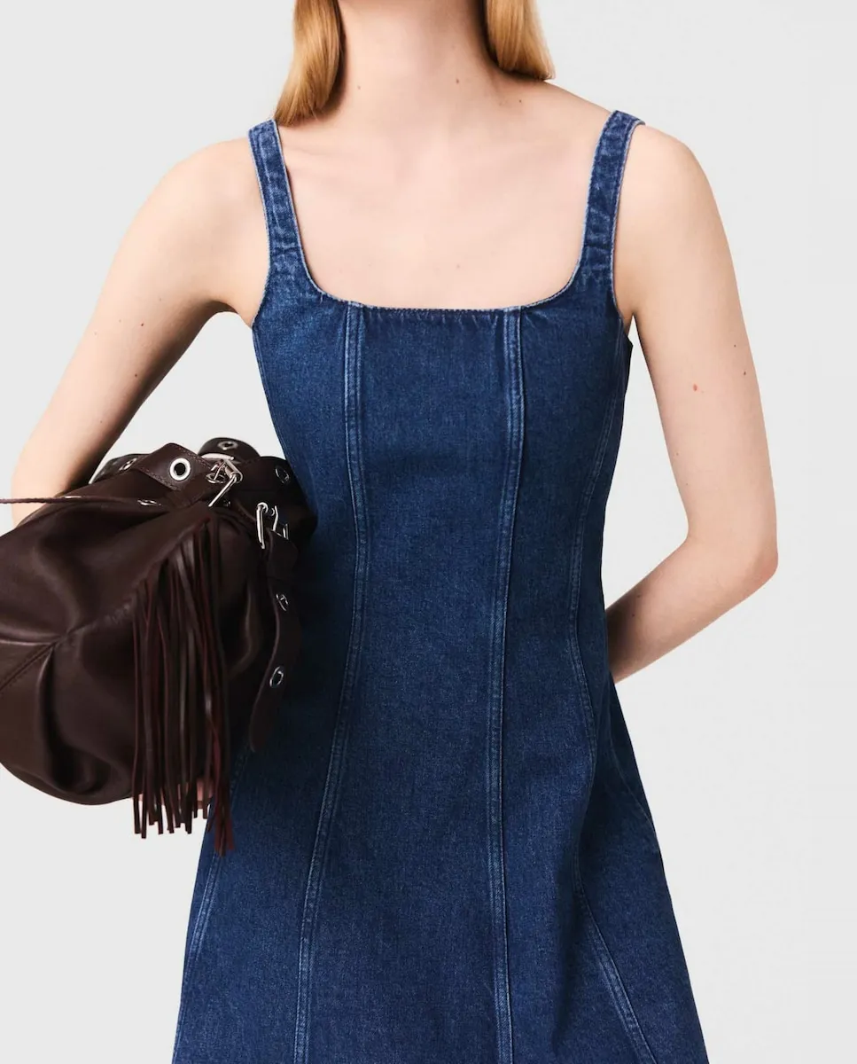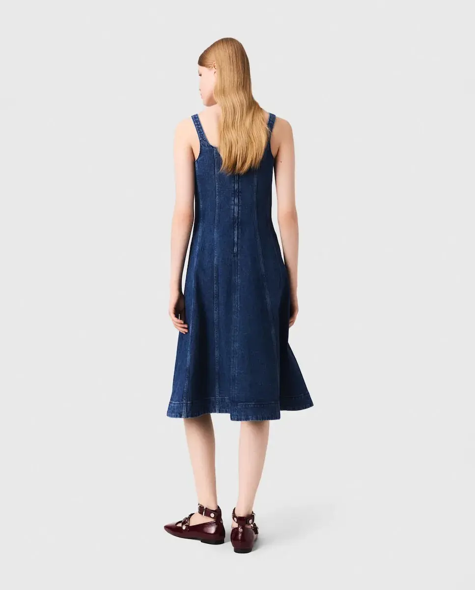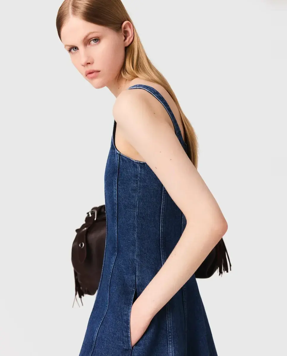 Длинное джинсовое платье. Круглый вырез и бретели. Расклешенная юбка. Застежка на молнии сзади. Мгновение, задержавшееся в конце лета. Эта коллекция вызывает образ женщины между Сен-Тропе и Кассис, босиком по улочкам белого деревушки. Вдохновленная детскими воспоминаниями и рынками Прованса, она сочетает в себе простоту и элегантность. Вневременные вещи, которые продлевают лето и легким аккордом возвестят о возвращении. Большая тенденция сезона, джинсовая ткань возвращается в этом длинном платье, сочетая стиль и женственность. С расклешенным кроем оно рисует как современный, так и структурированный силуэт. С круглым вырезом и бретелями, оно открывает карманы и застежку сзади.
