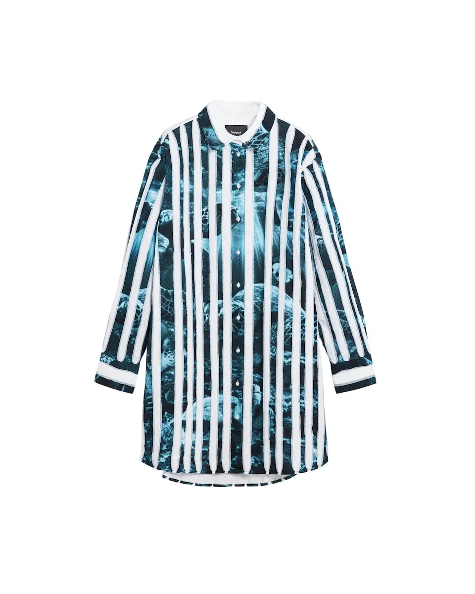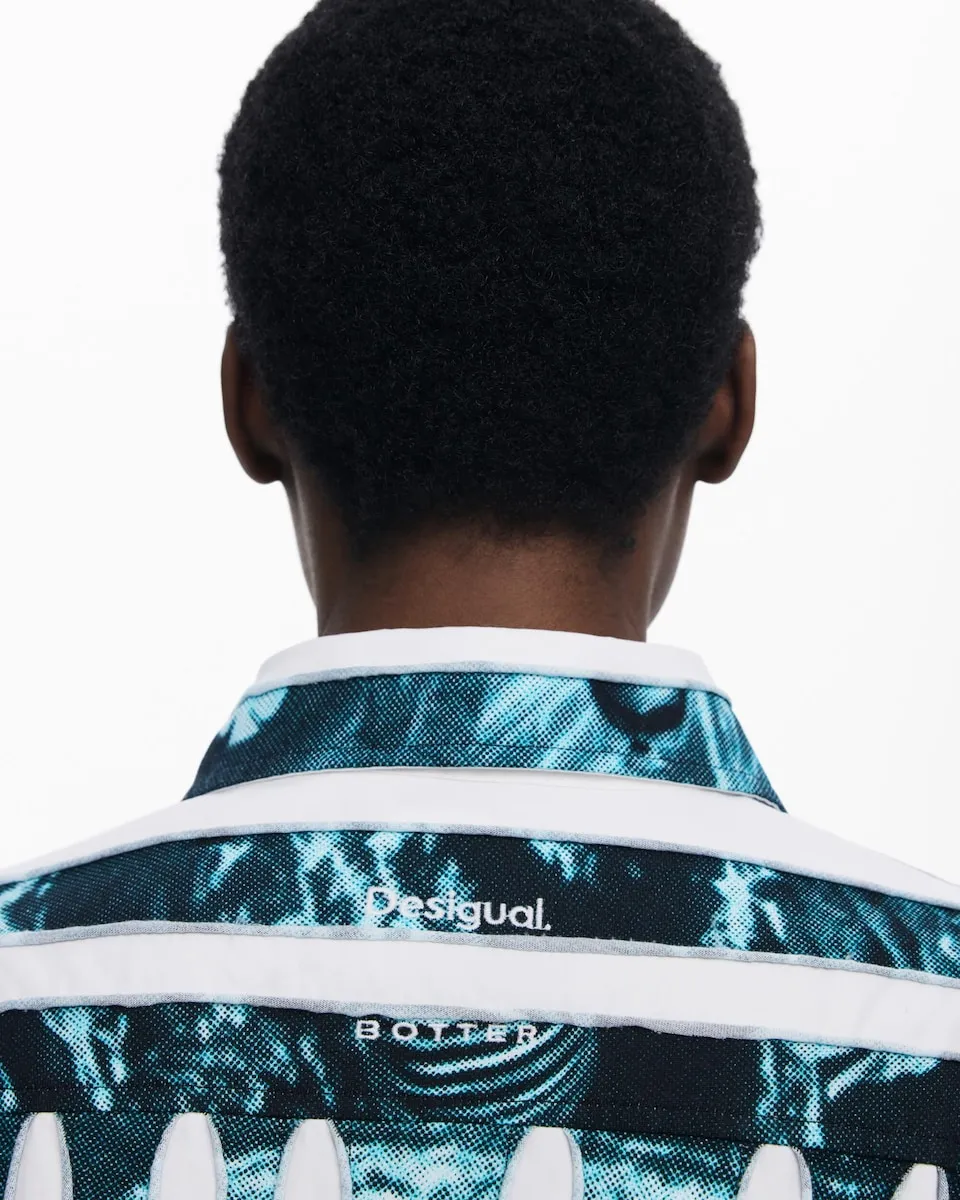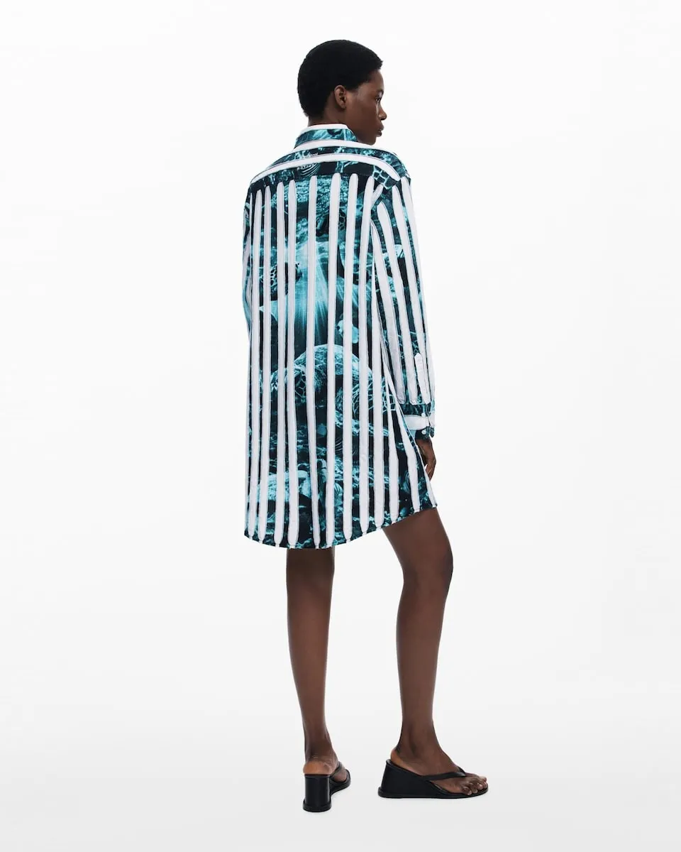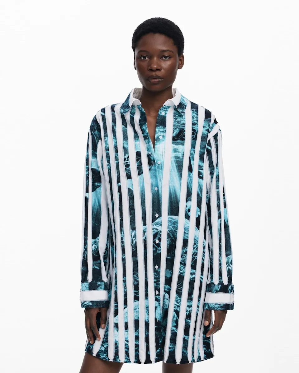 Рубашечное платье оверсайз из поплина с детализированными панелями в стилистике футболки и принтом, вдохновленным подводными ландшафтами. Крой: оверсайз. Длина: миди. Воротник: рубашечный. Рукав: длинный. Внутри с контрастной подкладкой. Вышивка на ярлыке: Desigual x Botter. Botter. Покупая изделия из хлопка от Desigual, вы поддерживаете наши инвестиции в Better Cotton. Этот продукт производится через систему баланса масс и может не содержать Better Cotton. bettercotton.org/massbalance..