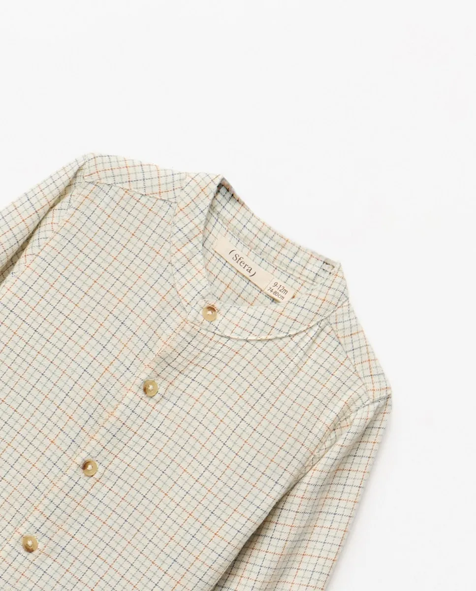 Рубашка с длинными рукавами и воротником мао с принтом. Закрывается спереди на пуговицы.
