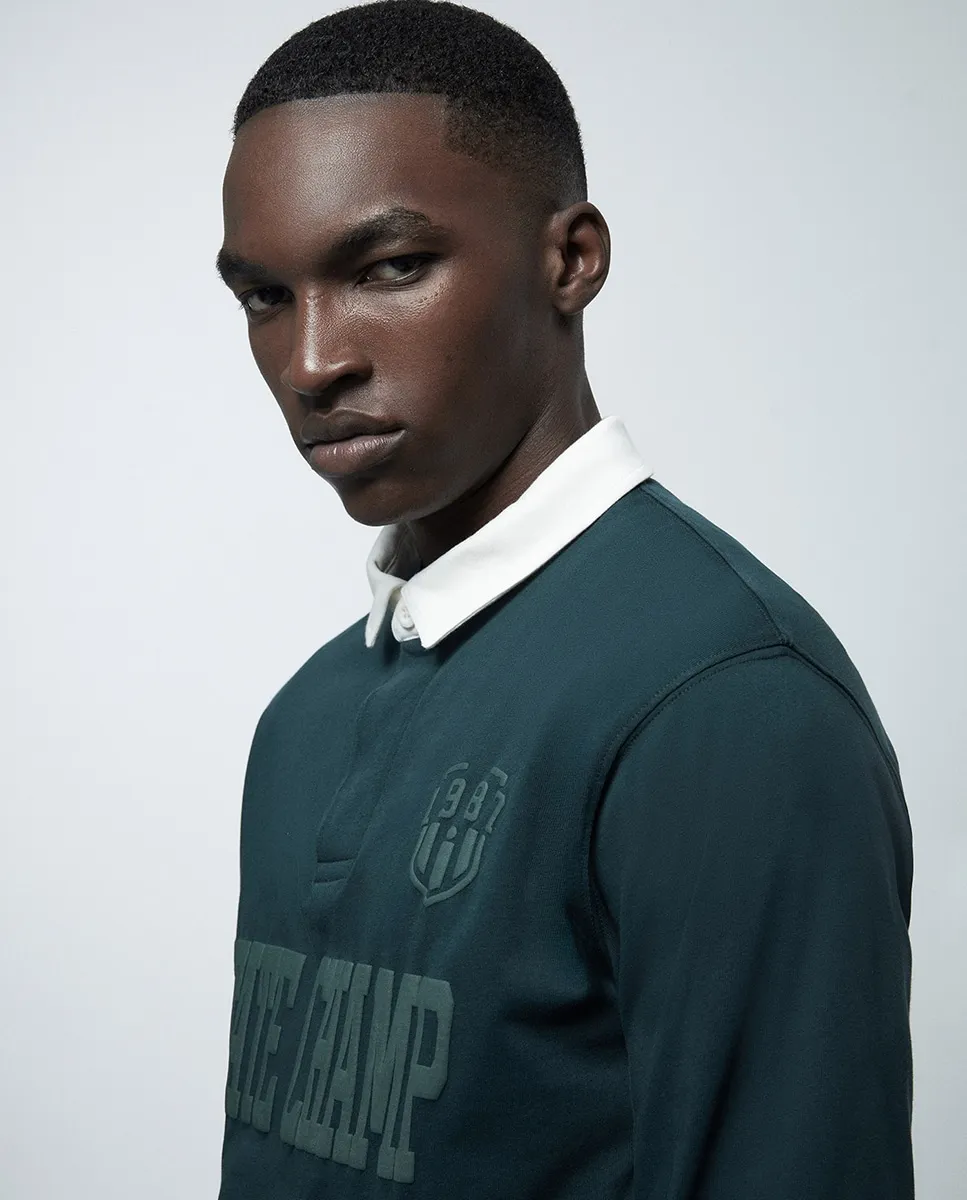 Рубашка поло с длинными рукавами и текстом спереди. 100% хлопок.