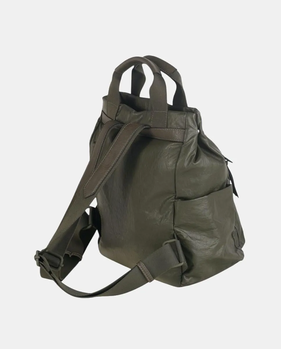 Рюкзак цвета оливкового хаки из PU с эффектом морщин, создающим ощущение мягкости и комфорта, с тонкими швами, которые подчеркивают его структурированный силуэт. Его дизайн включает практичный фронтальный карман на молнии, идеально подходящий для быстрого доступа к необходимым вещам. Также есть верхняя молния и задний карман на молнии. У него есть две верхние ручки, которые обеспечивают универсальность и комфорт, а также регулируемые задние ручки. Все металлические детали и логотип выполнены в тон сумки, придавая ей современный вид.