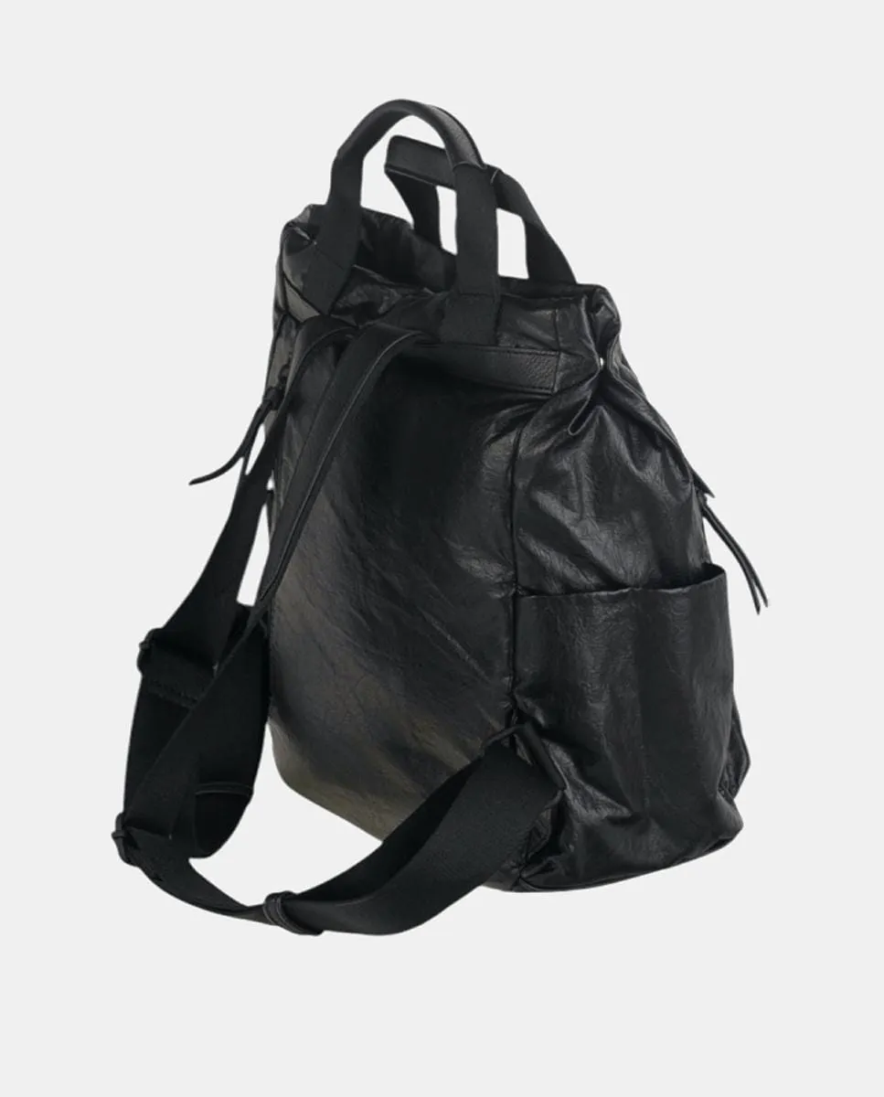 Рюкзак черного цвета из искусственной кожи с эффектом помятости для ощущения мягкости и комфорта, с тонкими швами, подчеркивающими его структурированный силуэт. Его дизайн включает в себя практичный карман спереди на молнии, идеально подходящий для быстрого доступа к необходимым вещам. Также имеется верхняя молния и задний карман на молнии. Есть две верхние ручки, которые обеспечивают универсальность и комфорт, а также задние ручки, которые регулируются. Все металлические элементы и логотип отделаны в цвет сумки, чтобы придать современный вид.