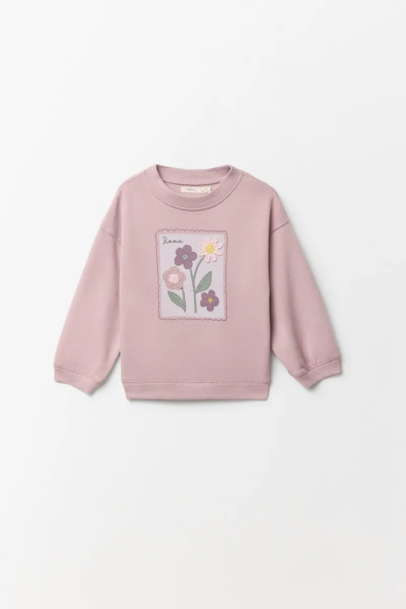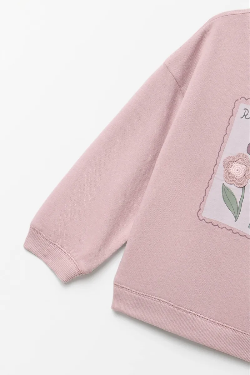Свитшот с длинными рукавами и круглым вырезом с принтом спереди и кружевной отделкой