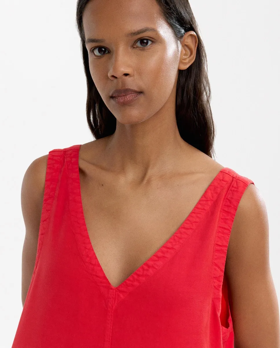 Платье миди 100% лиоцелл. Вырез в форме буквы V. Боковые карманы. Нижний фронтальный разрез. Ярко выраженные швы. Модель ростом 1,76 м и носит размер S.