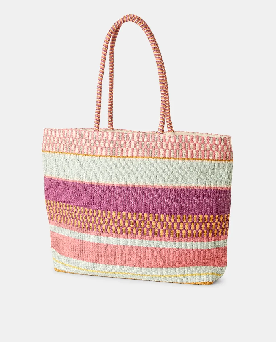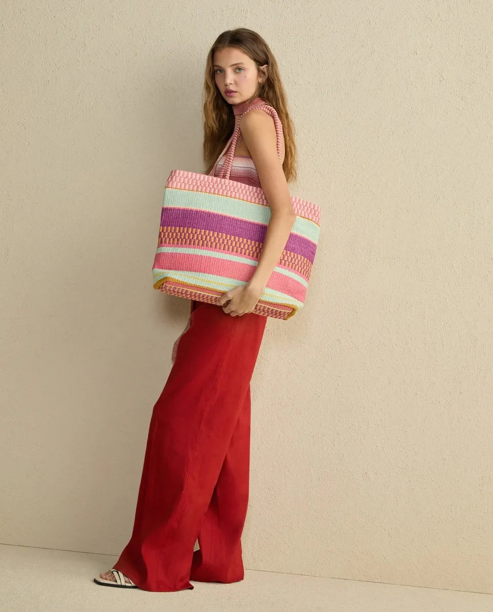 Сумка для пляжа типа shopper с средней ручкой и ярлыком бренда на передней стороне.