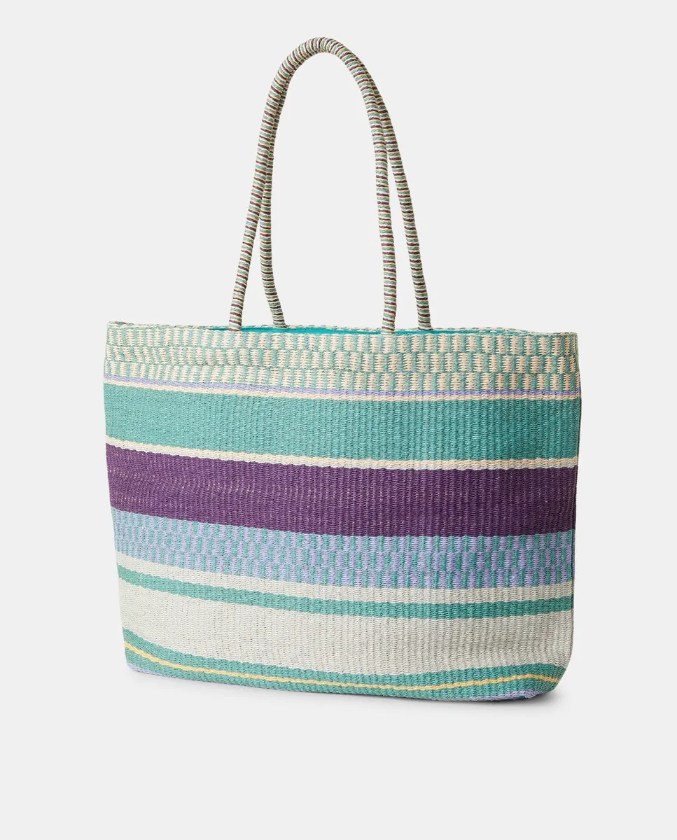 Сумка для пляжа типа shopper с средней ручкой и ярлыком бренда на передней стороне.