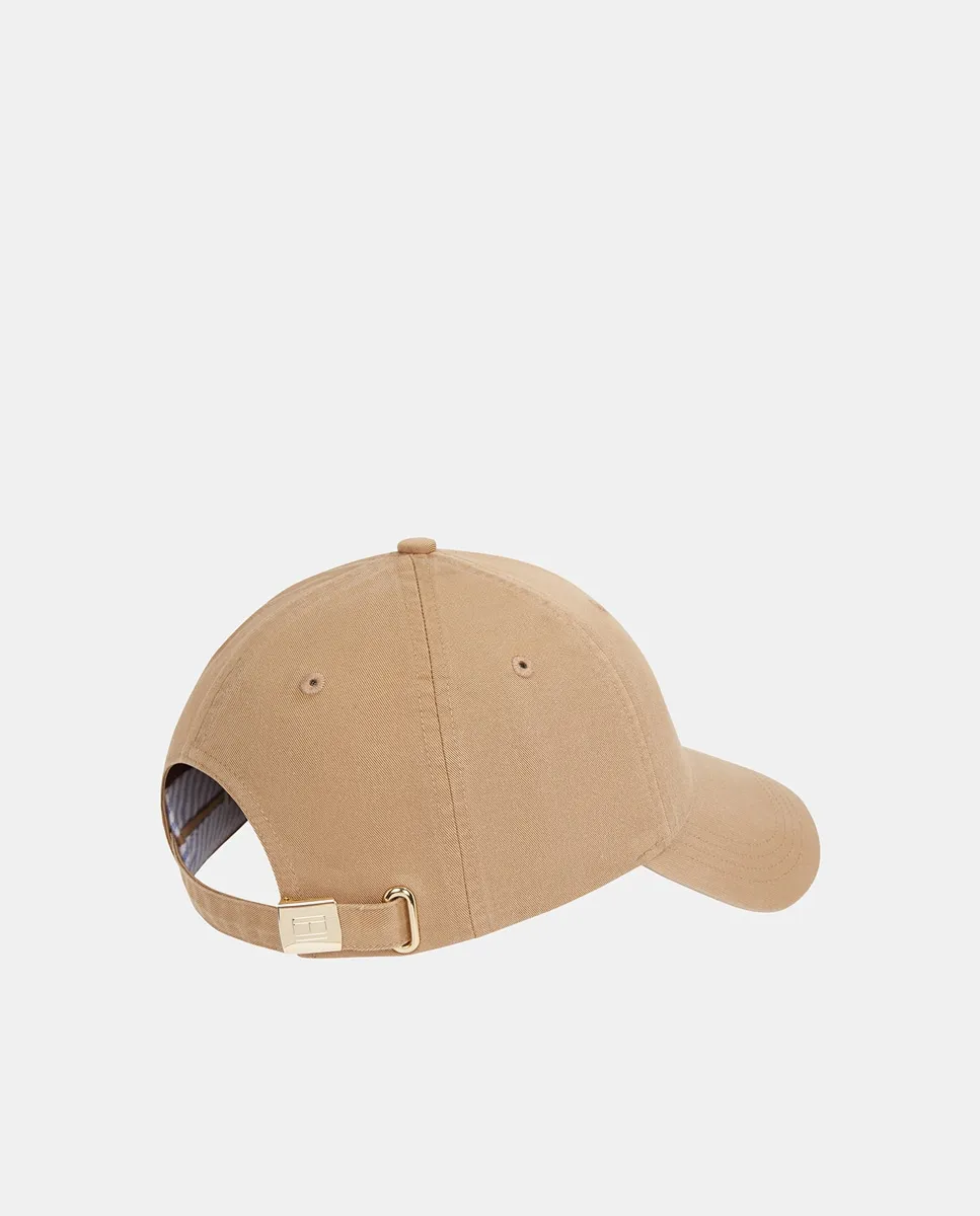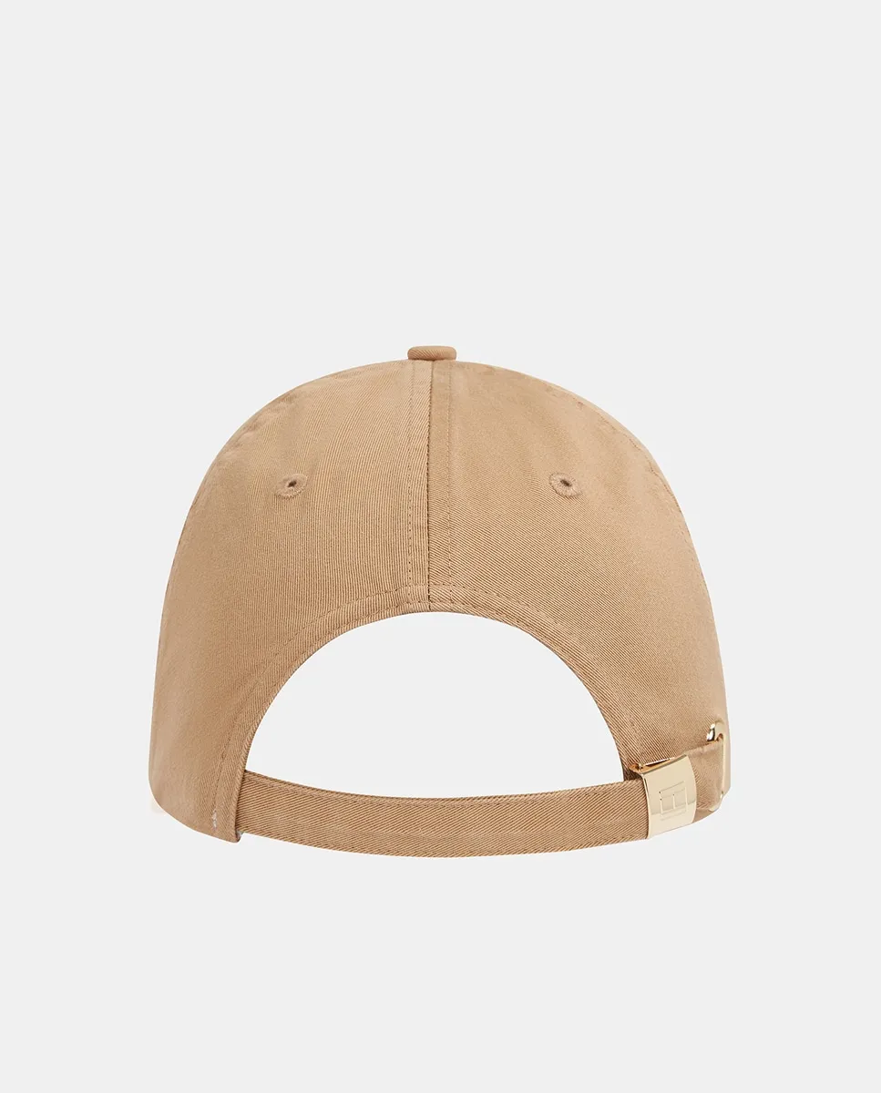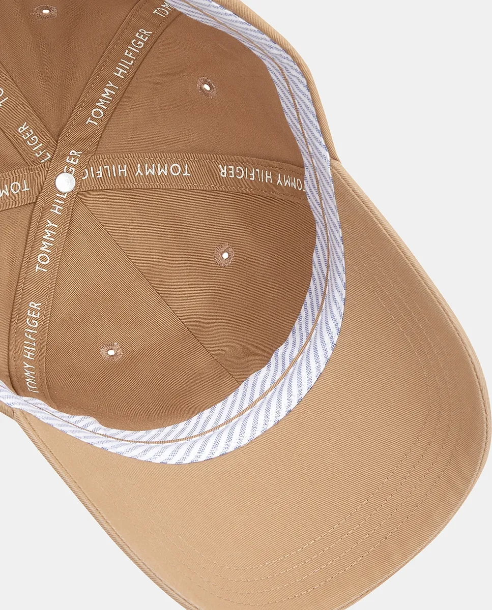 Женская шляпа, изготовленная из соломы. Дизайн с полосами темно-синего цвета и металлическим логотипом Tommy Hilfiger спереди.