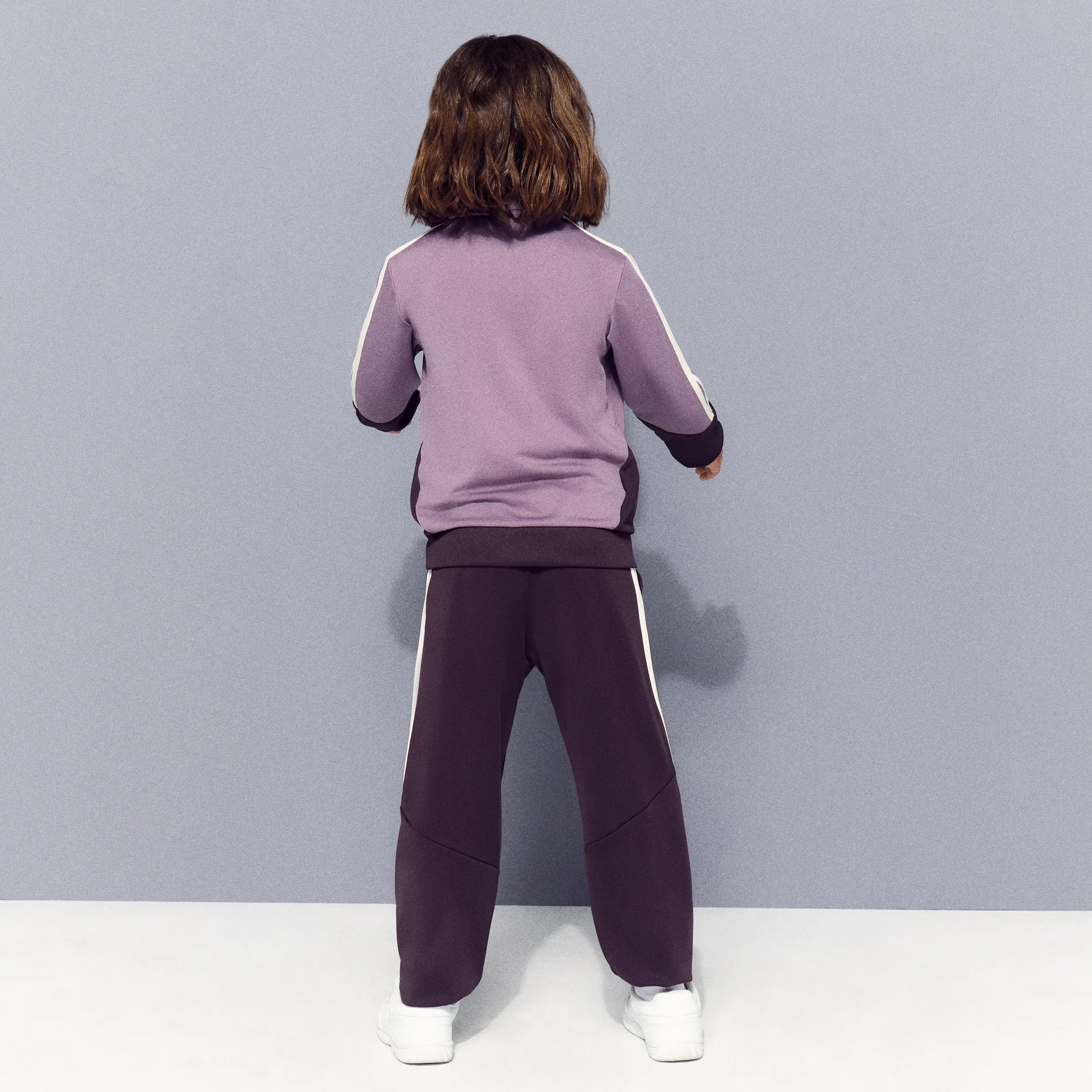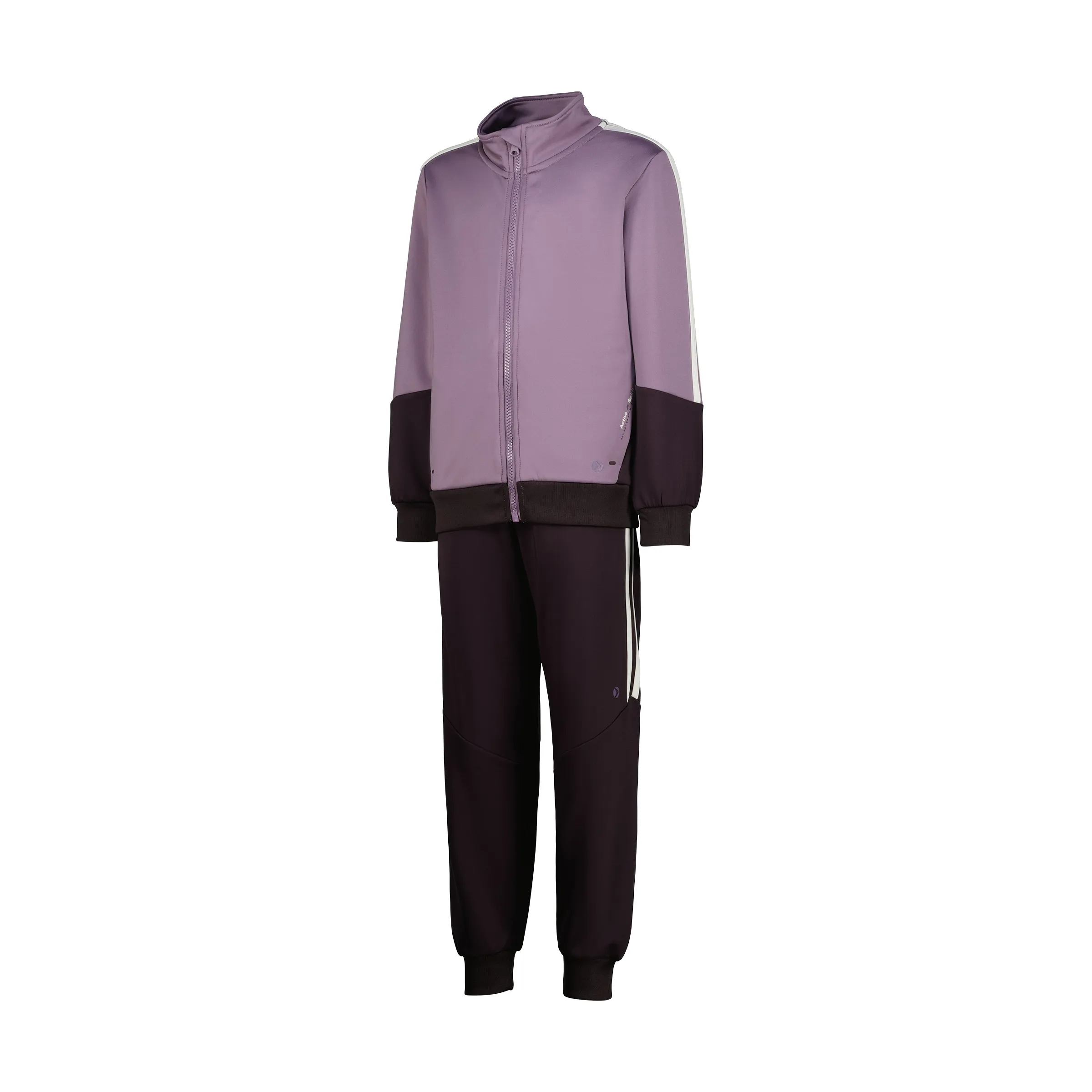 Спортивный костюм для девочки из прочного, дышащего, эластичного и быстро сохнущего материала. Имеет карманы как на брюках, так и на куртке, а также регулировку на талии с помощью шнурка.