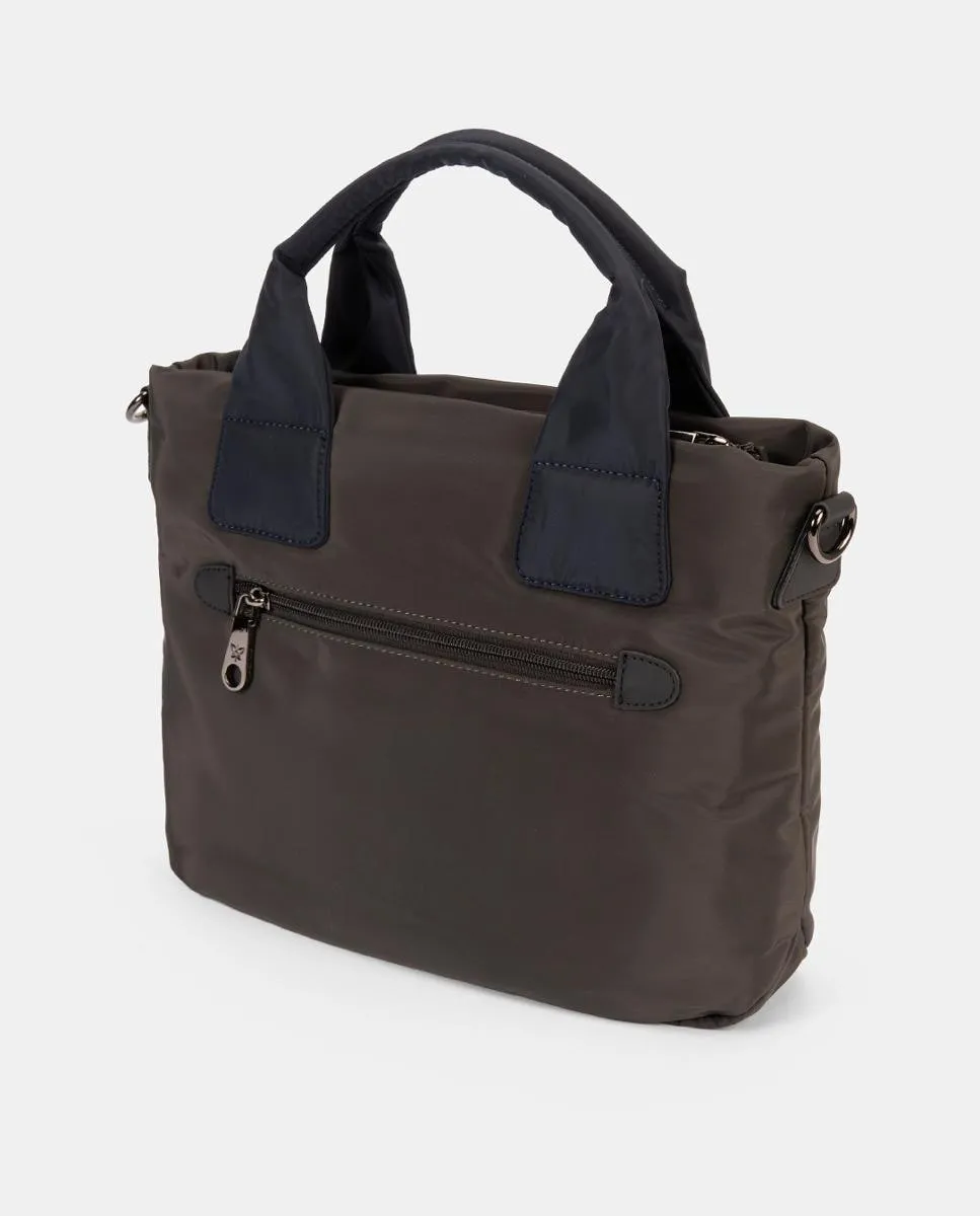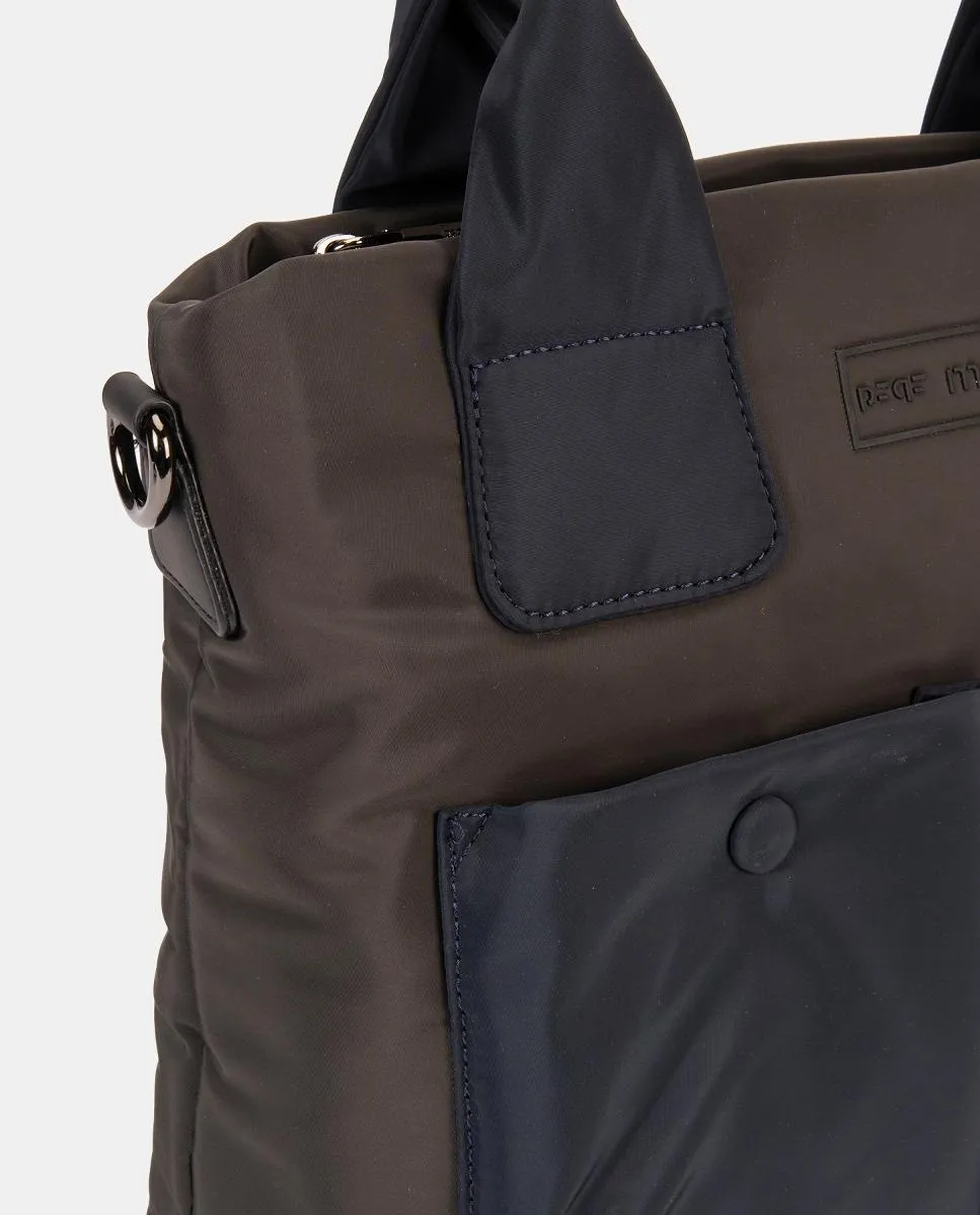 Двухцветная нейлоновая сумка с передними карманами и регулируемыми ручками.