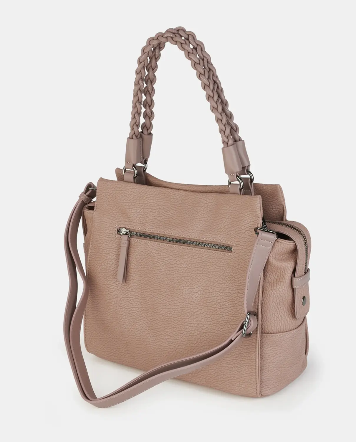 Шоппер цвета баклажан с застежкой-молнией и задним карманом на молнии. Две ручки и длинный регулируемый ремешок, снимающийся.