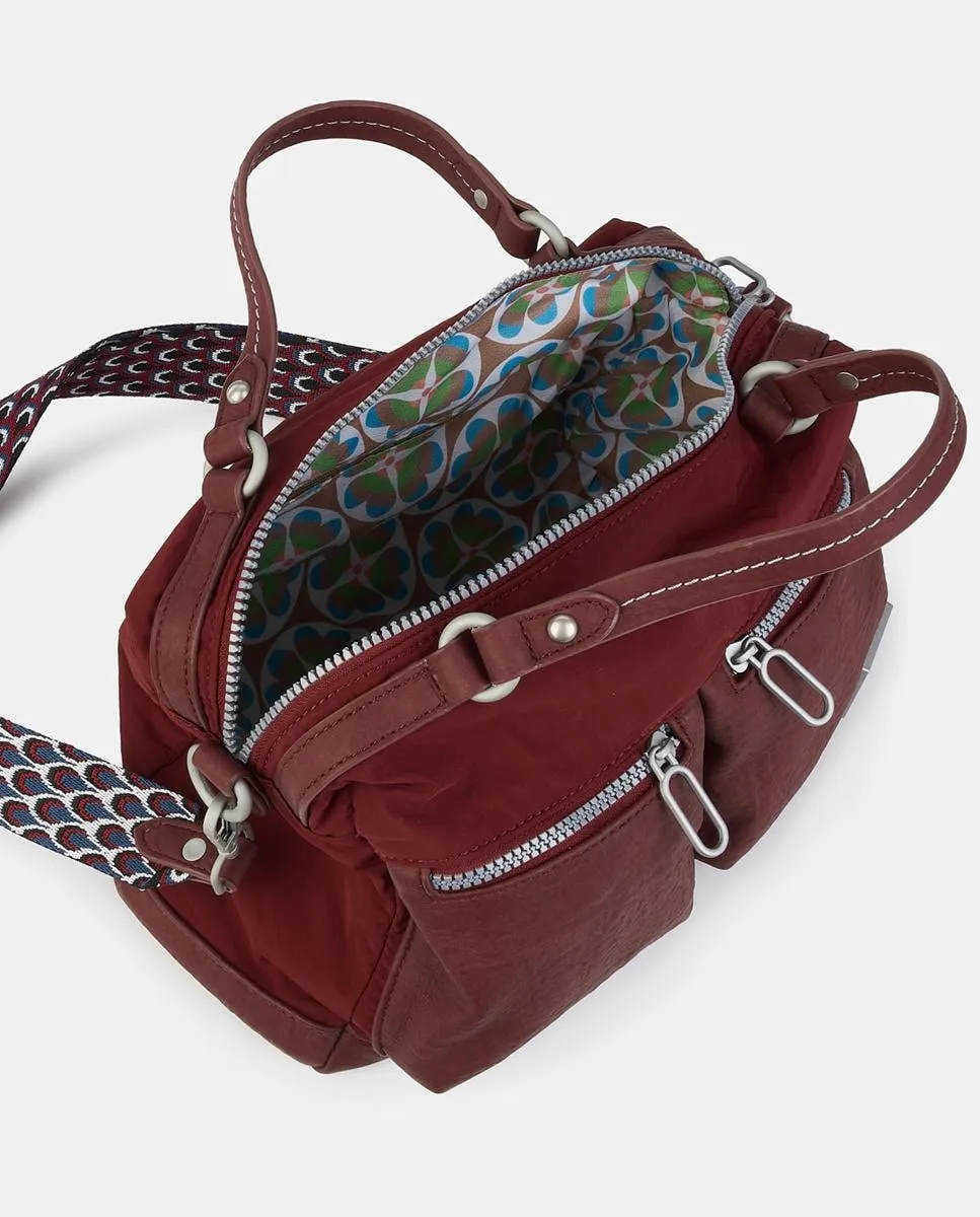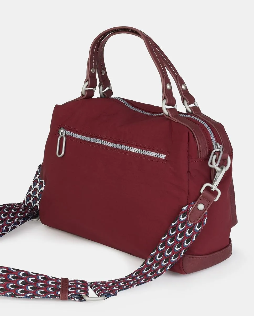 Бордовый боулинг с застежкой-молнией. Два внешних кармана на молнии, задний и внутренний карман на молнии. Два коротких ручки и регулируемый длинный ремень на кнопках.