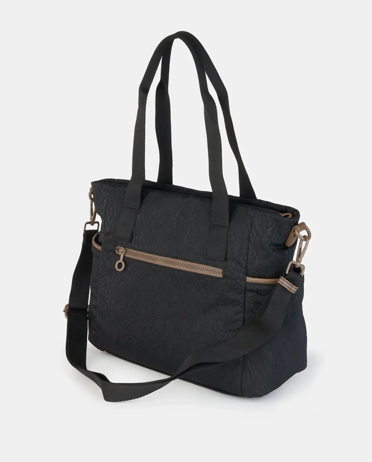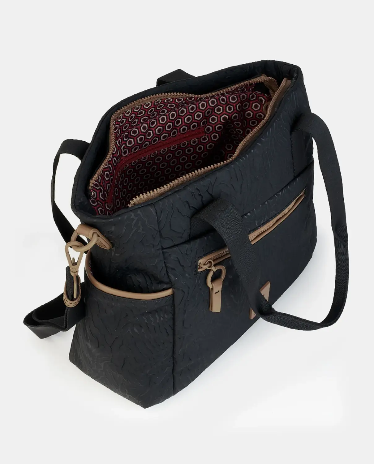 Шоппер бордового цвета с застежкой-молнией, внешним и задним карманами на молнии. Две ручки и длинный плечевой ремень.