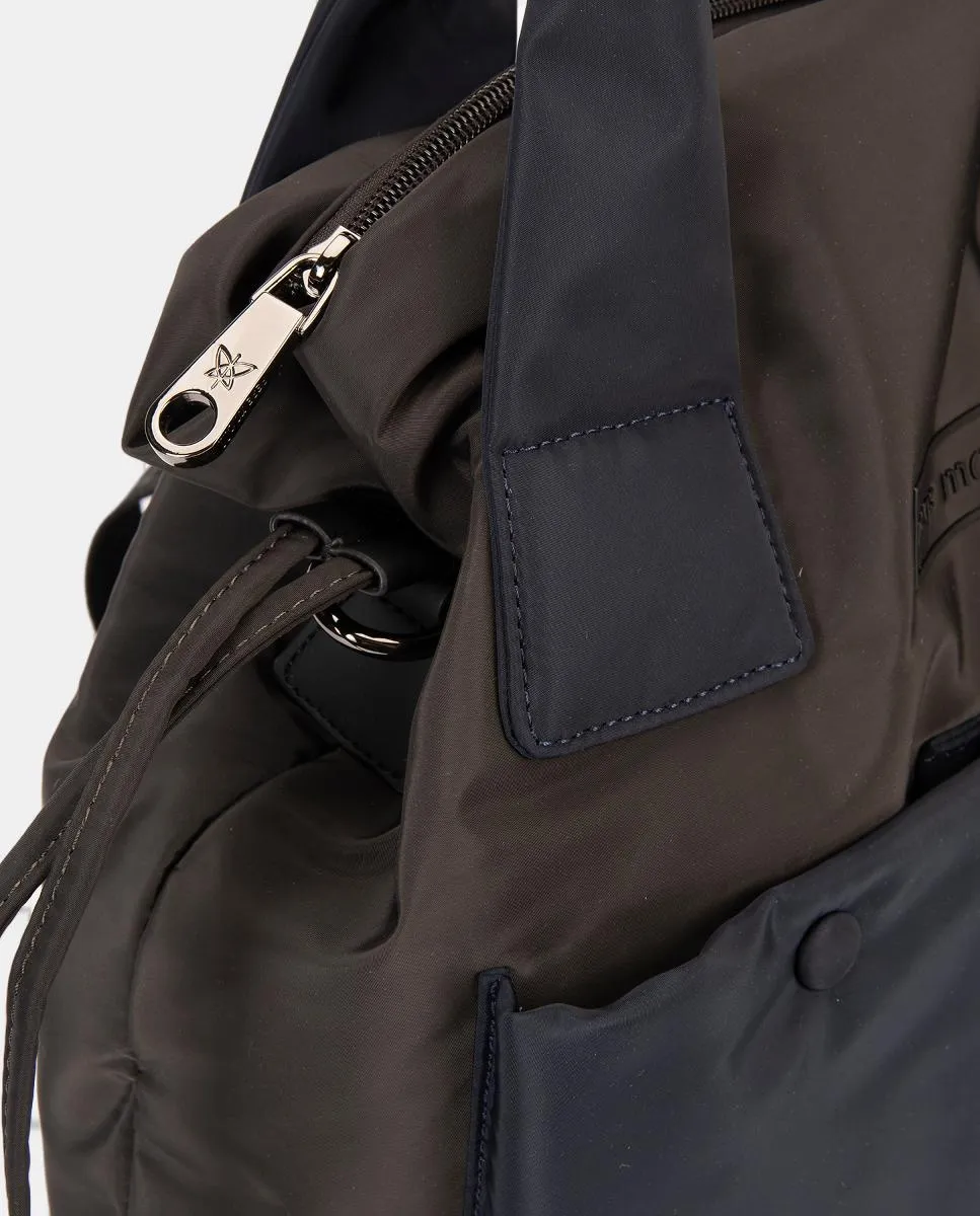 Двухцветная нейлоновая сумка-рюкзак с передними карманами и регулируемыми ручками в формате сумки или рюкзака.