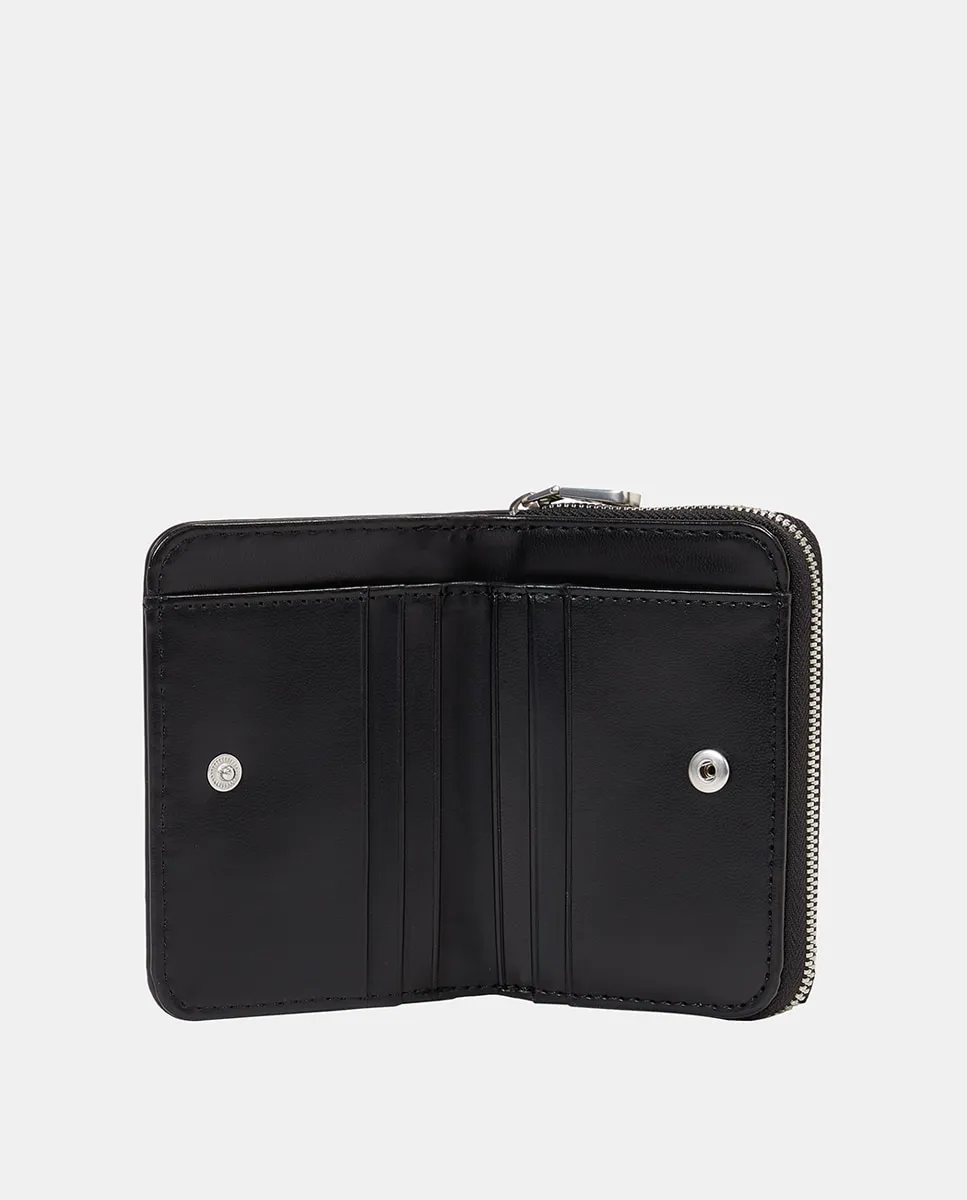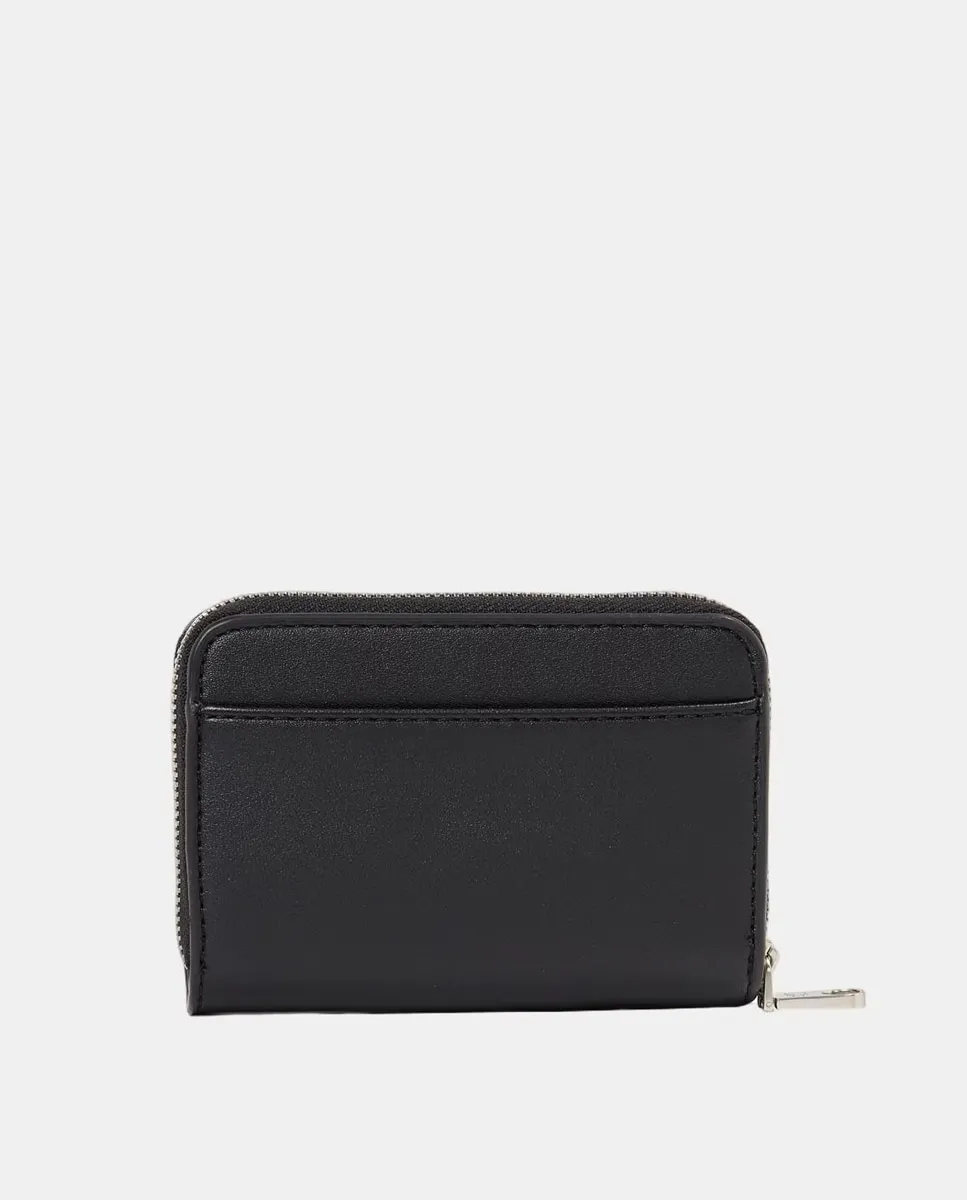 Женская сумка с выгравированным логотипом черного цвета, с застежкой на молнии.