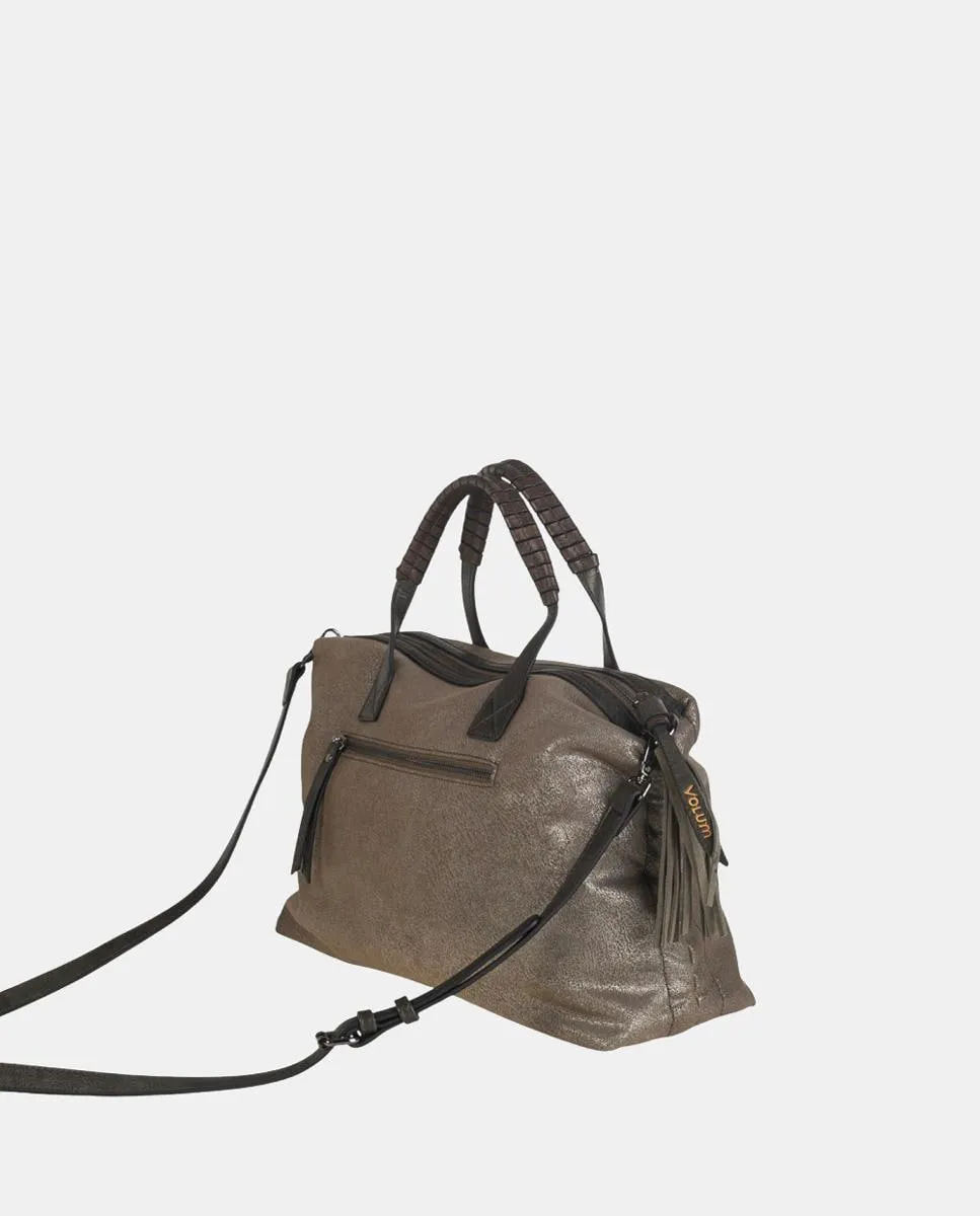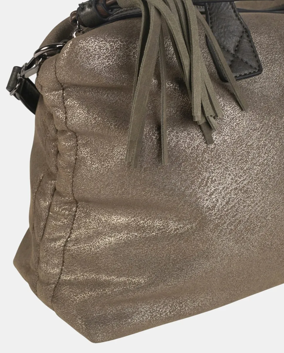 Сумка через плечо в стиле боулинг с двумя ручками, сделанная из очень мягкого материала с приятной на ощупь эффектом замши бежевого цвета и металлической отделкой, которая придает яркость и модный акцент. Ручки выполнены из искусственной кожи тон в тон с легким контрастом в отделке, которая украшает всю верхнюю часть. Закрытие на металлическую молнию с фирменным язычком, выполненным из замши, с дополнительной деталью объемного логотипа в контрастном цвете, что добавляет цветовой акцент. Эта сумка-хобо имеет металлическую молнию на задней части и дополнительную плечевую ручку.