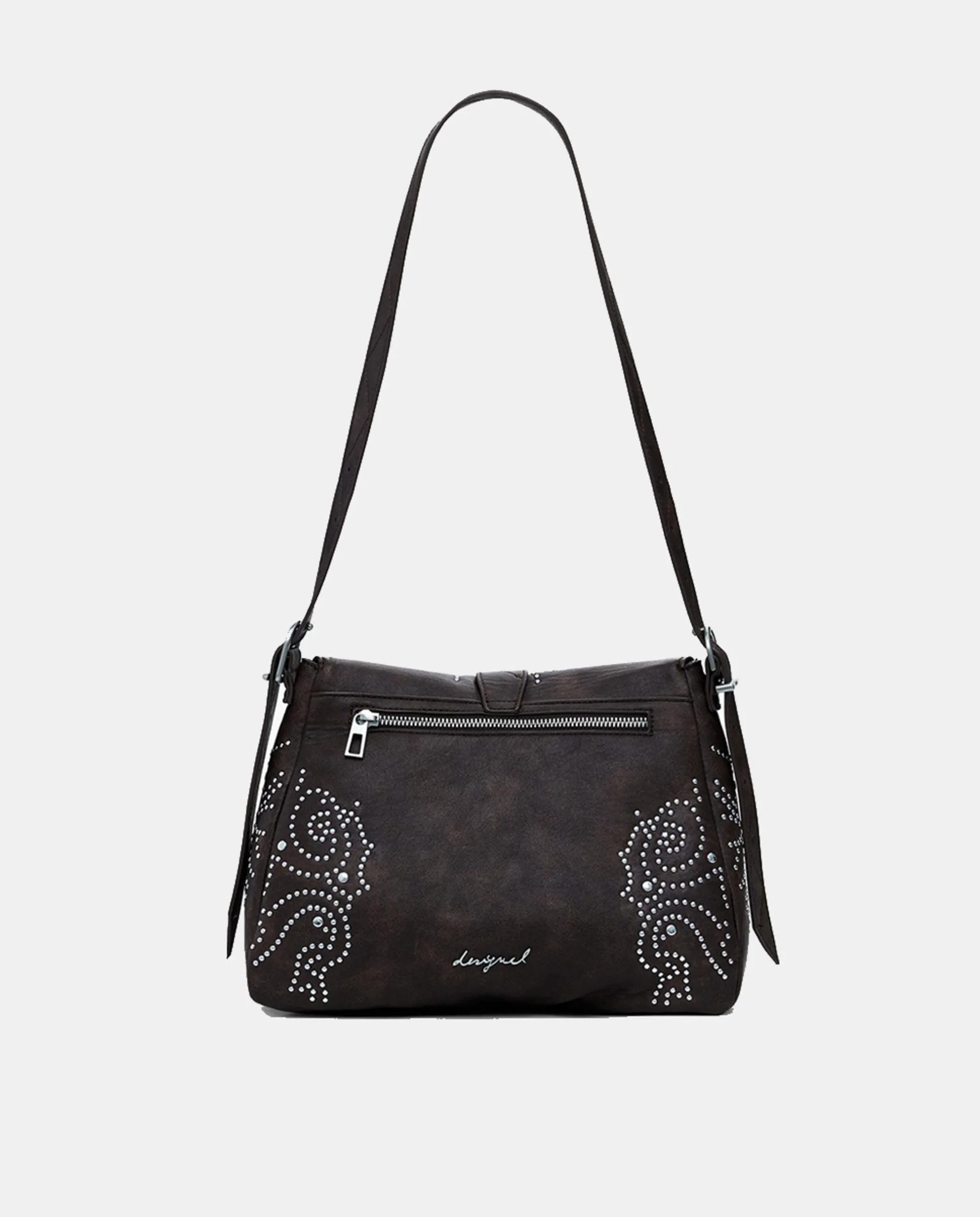 Сумка через плечо среднего размера, из ткани с эффектом кожи, с застежкой на молнии, с металлическими шипами и декоративной пряжкой.