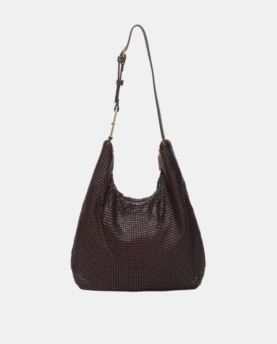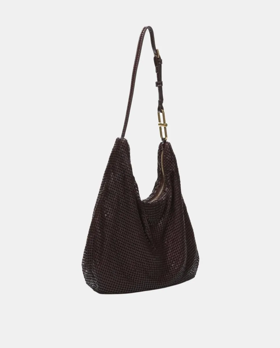 Сумка-хобо, изготовленная из металлической сетки. Ее большая внутренняя емкость, верхняя застежка на молнии и удобная плечевая ручка делают ее идеальной для переноски ваших необходимых вещей. Включает внутренний карман на молнии и подкладку, обеспечивая стиль и функциональность. Идеально подходит для особых мероприятий, это идеальный вариант для создания уникальных образов.