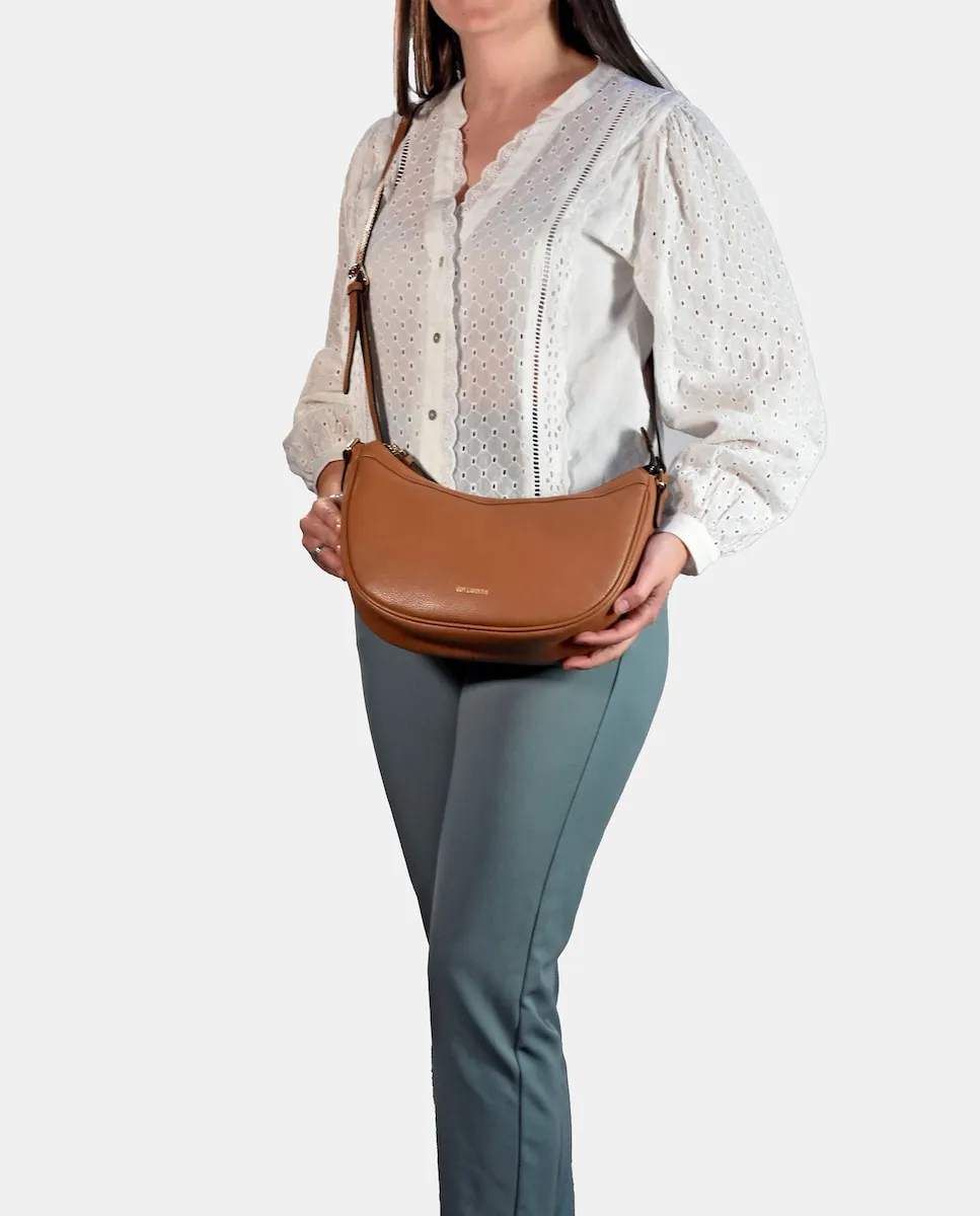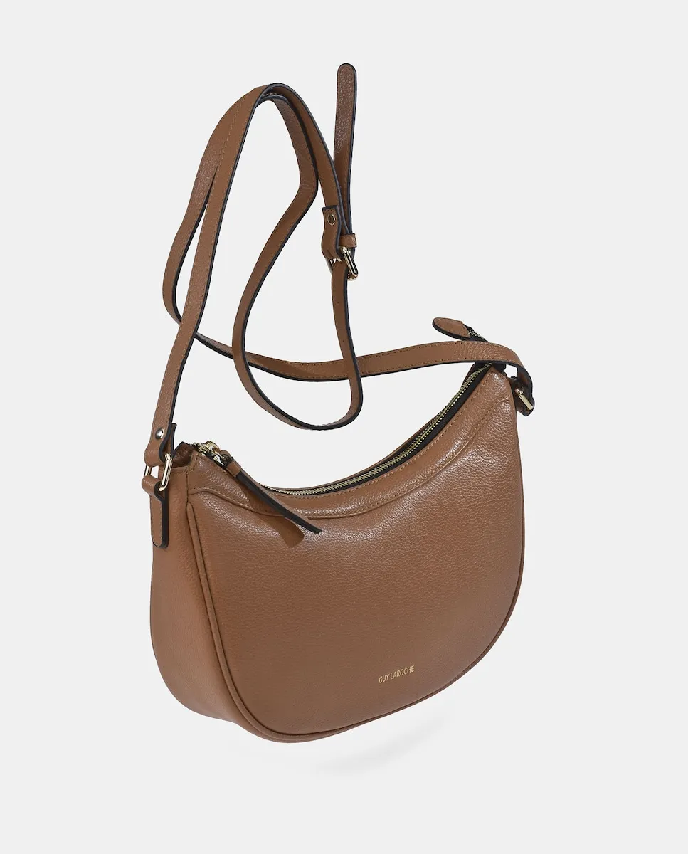 Кроссбоди-сумка типа гондола от Guy Laroche, выполненная из натуральной коровьей кожи, с регулируемым ремнем и основным закрытием на металлическую молнию, интерьер обит текстильным материалом и содержит 2 кармана, один из которых на молнии.