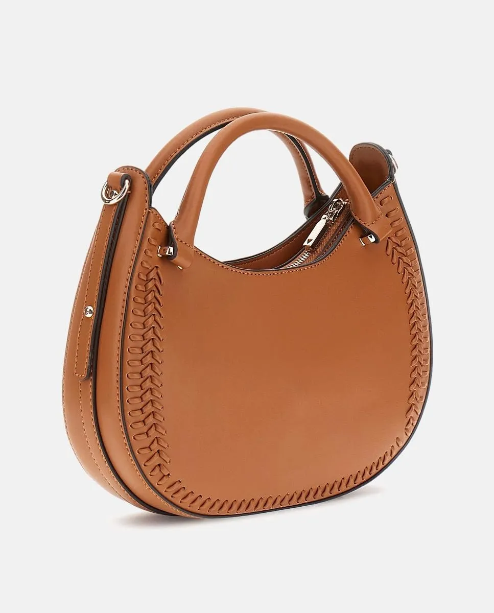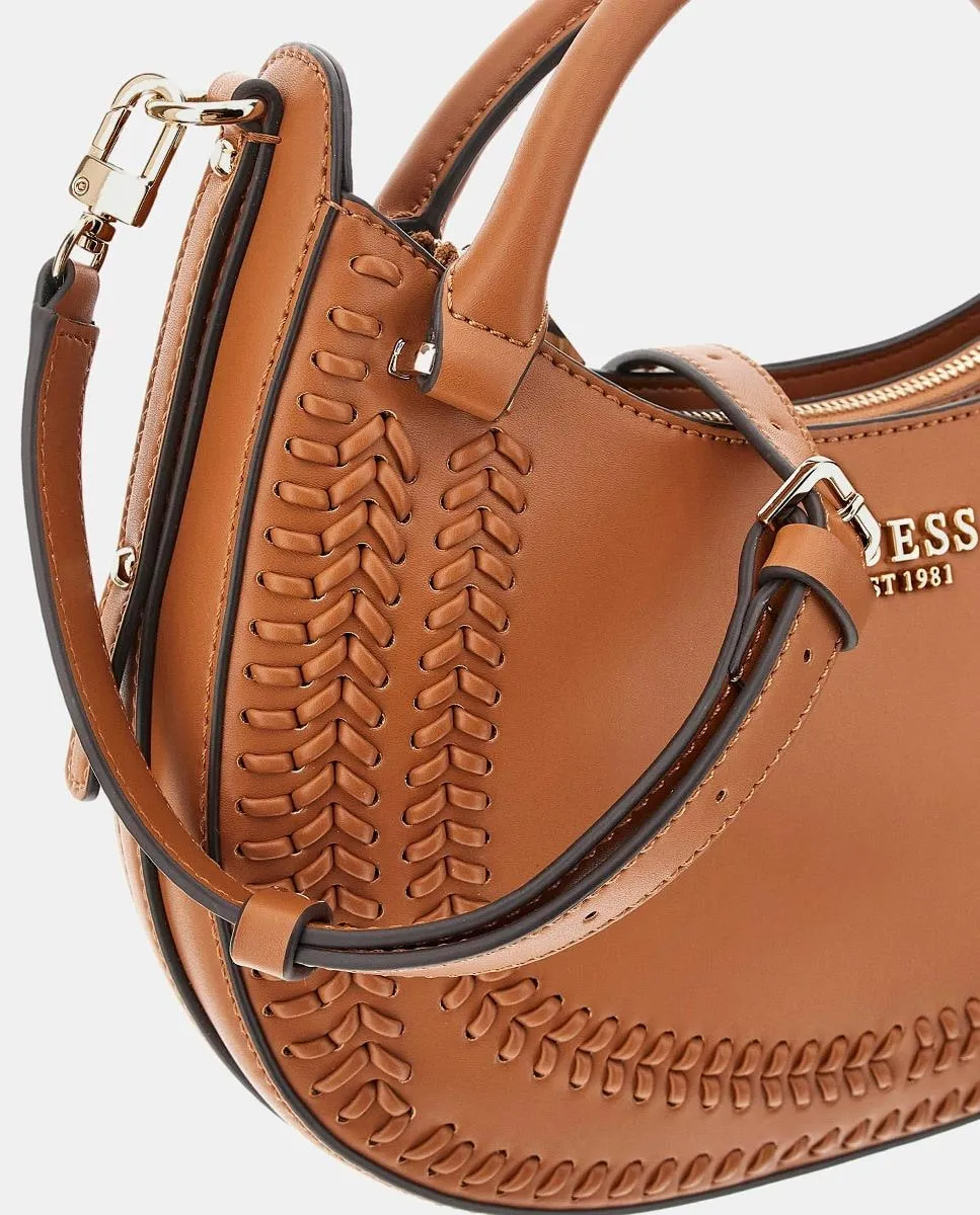 Сумка модели Татум с застежкой-молнией, двойными ручками и металлическим логотипом Guess 1981 золотого цвета на фронте
