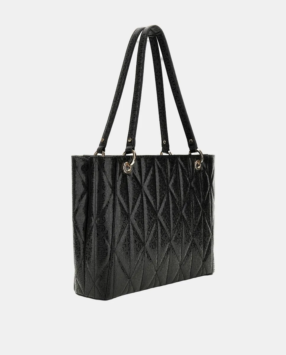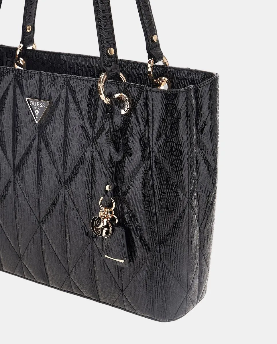 Сумка-тоут модели Альдина с мягким отделением, лакированным финишем и рисунком 4g с металлическим треугольным логотипом спереди в золотистом цвете.