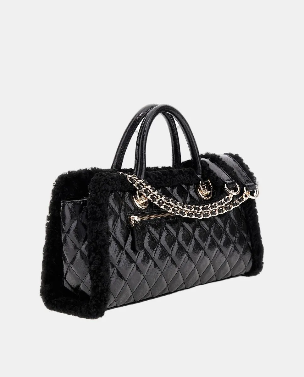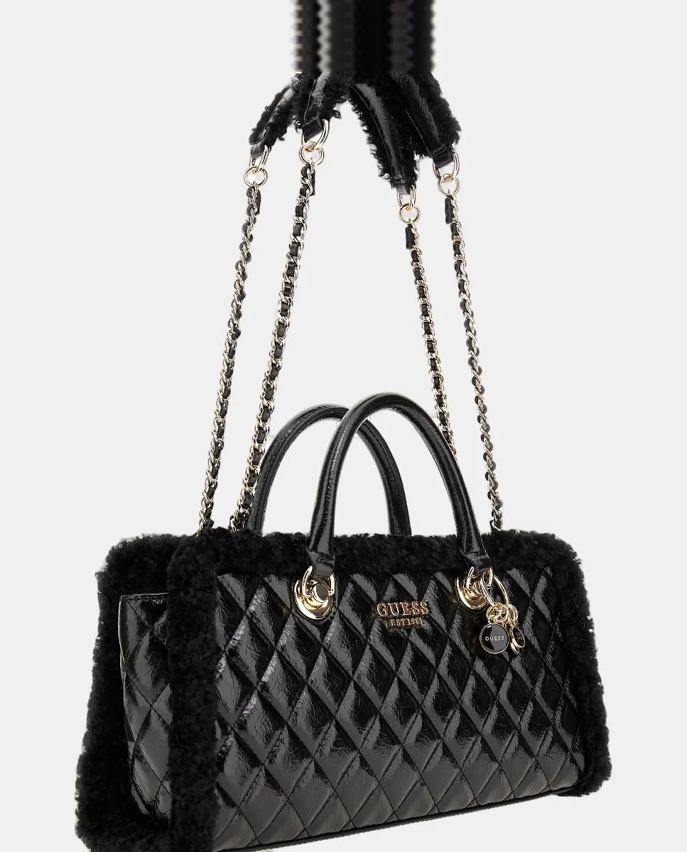Сумка через плечо модели Кристи с лакированной отделкой и овечьим мехом, двойные цепочные ручки, центральный металлический логотип Guess 1981 золотого цвета и задний карман на застежке-молнии.