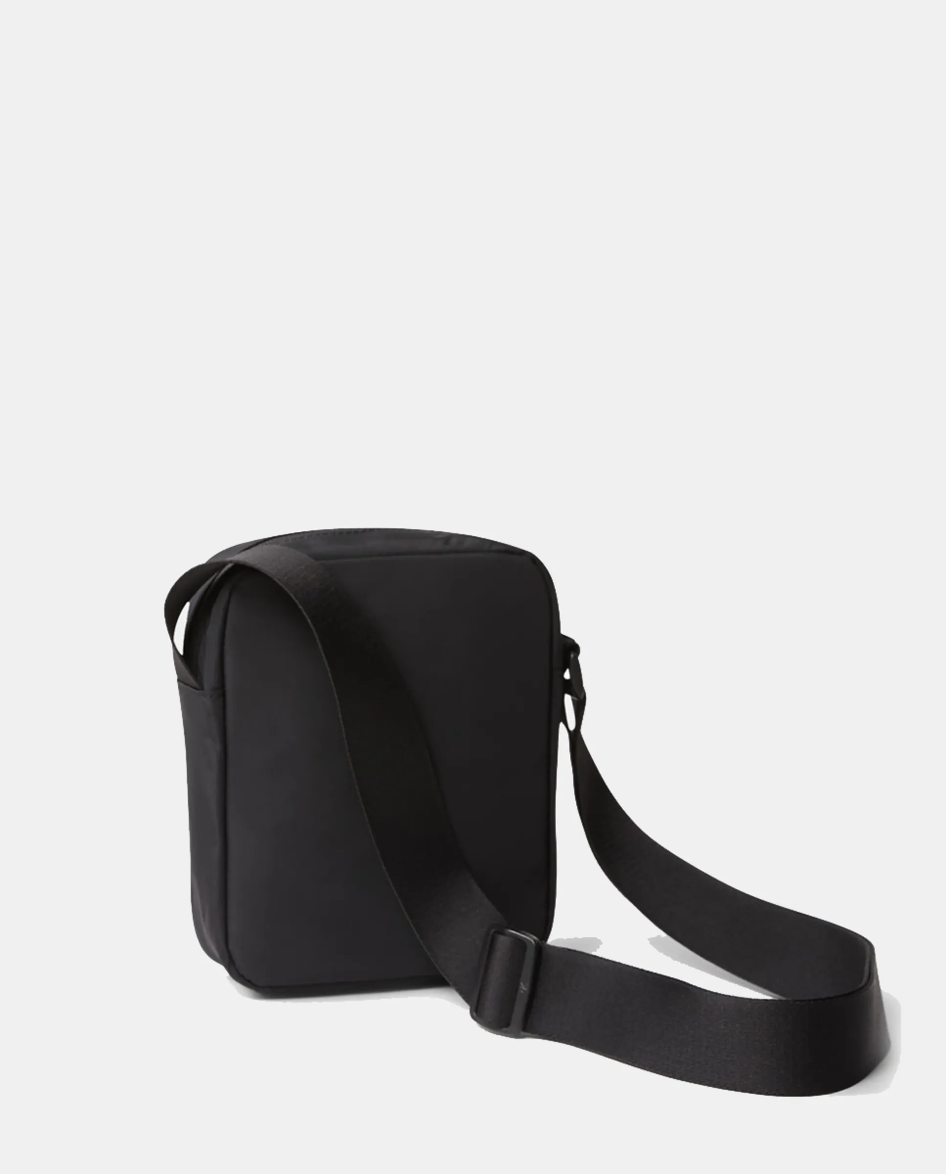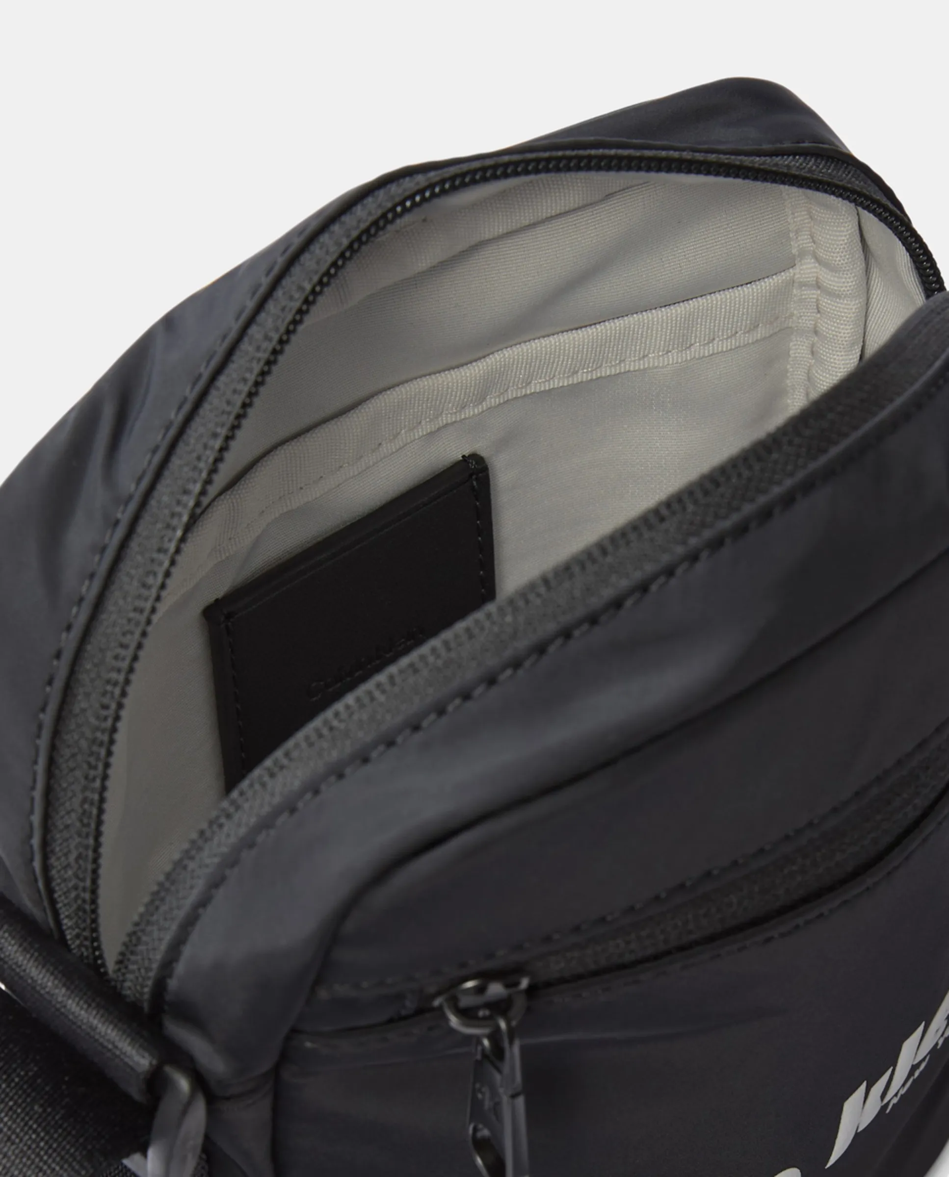 Мужская черная сумка через плечо с графическим логотипом. Застежка на молнии.