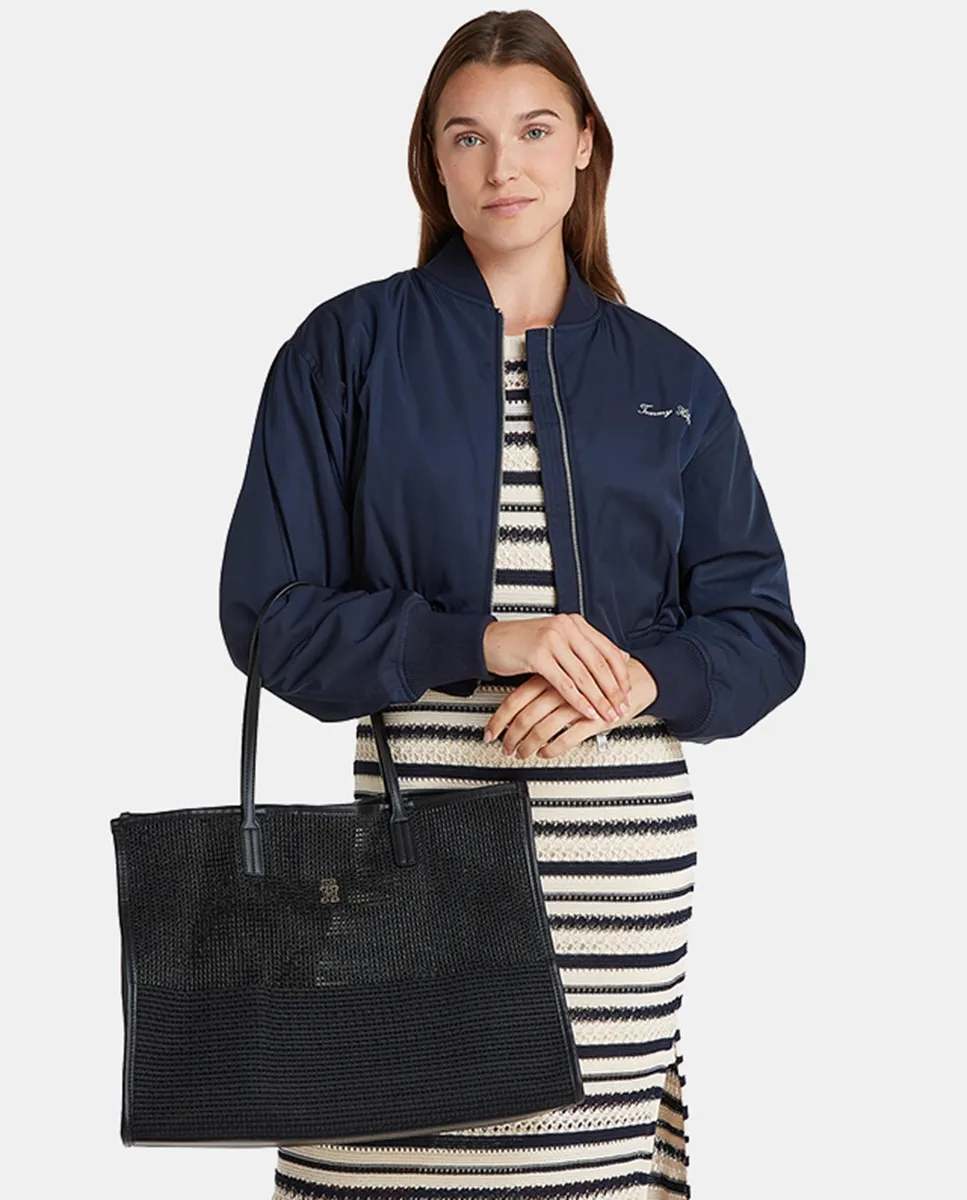 Женская сумка-тоут из рафии черного цвета. Дизайн с магнитной застежкой и логотипом Tommy Hilfiger на передней части.