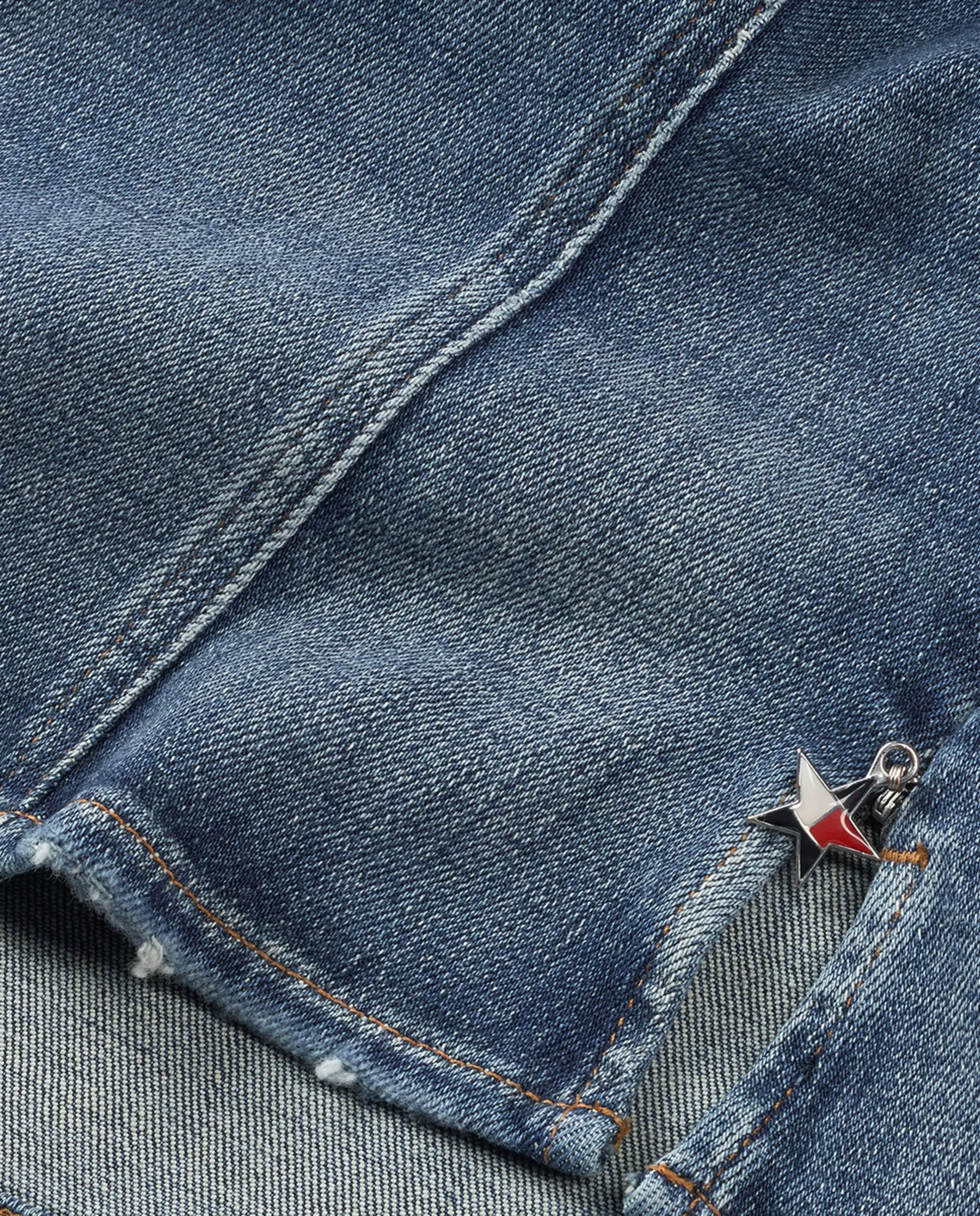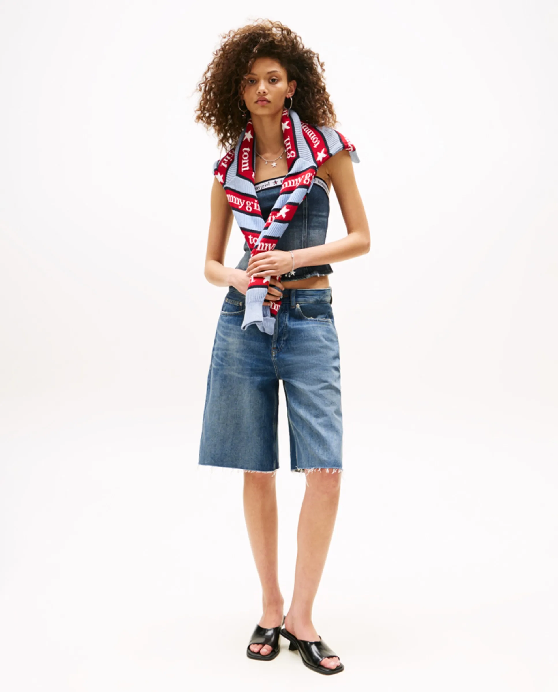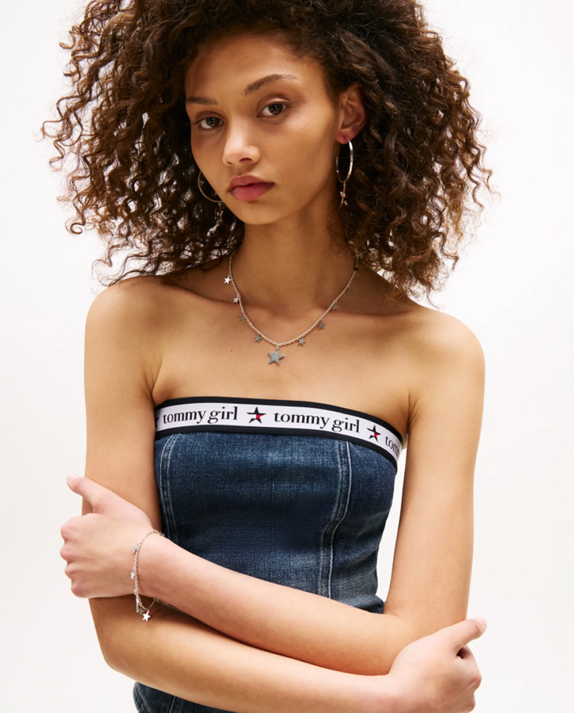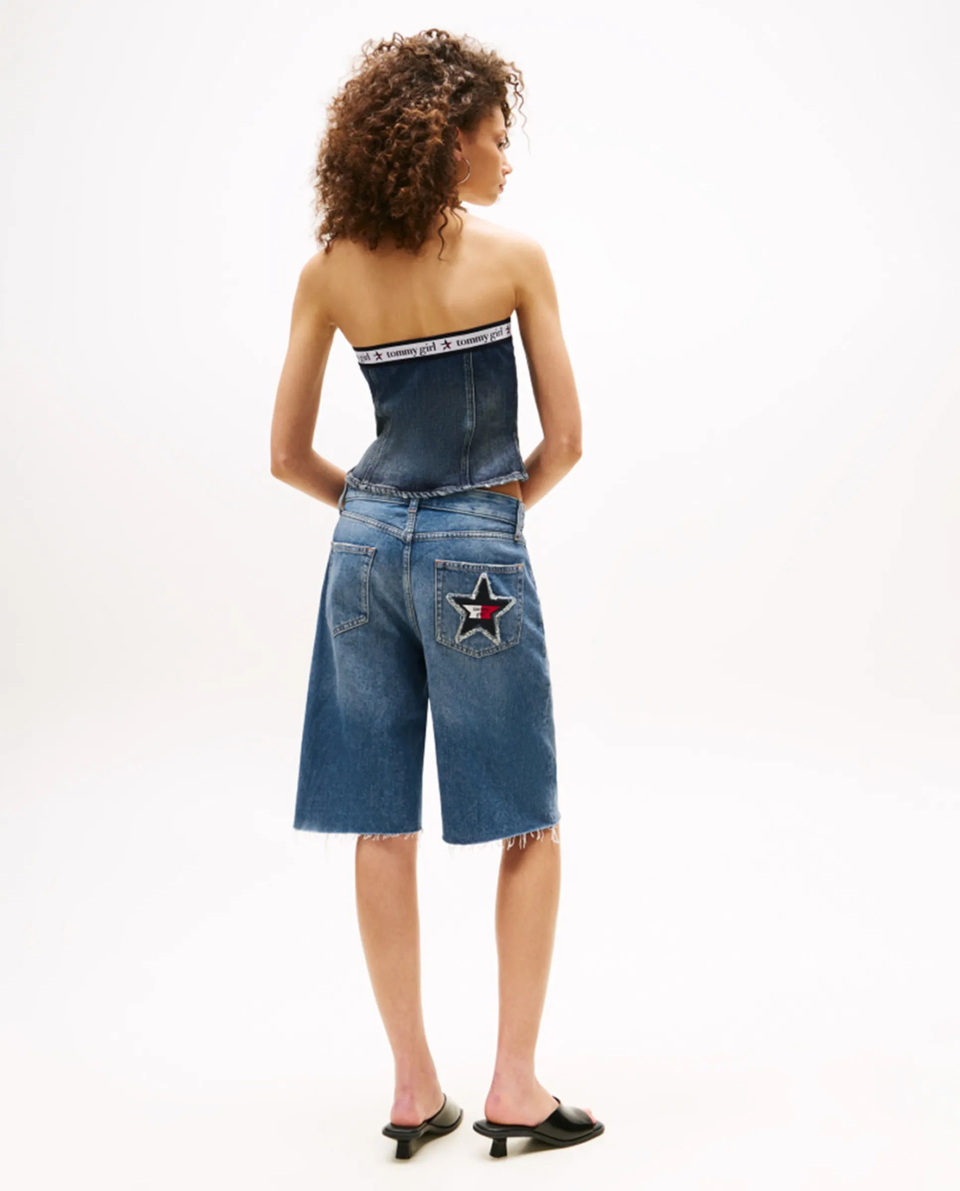 Топ из среднего синего денима с открытыми плечами из эксклюзивной капсульной коллекции Tommy Girl. Имеет деталь с персонализированным поясом для капсулы.
