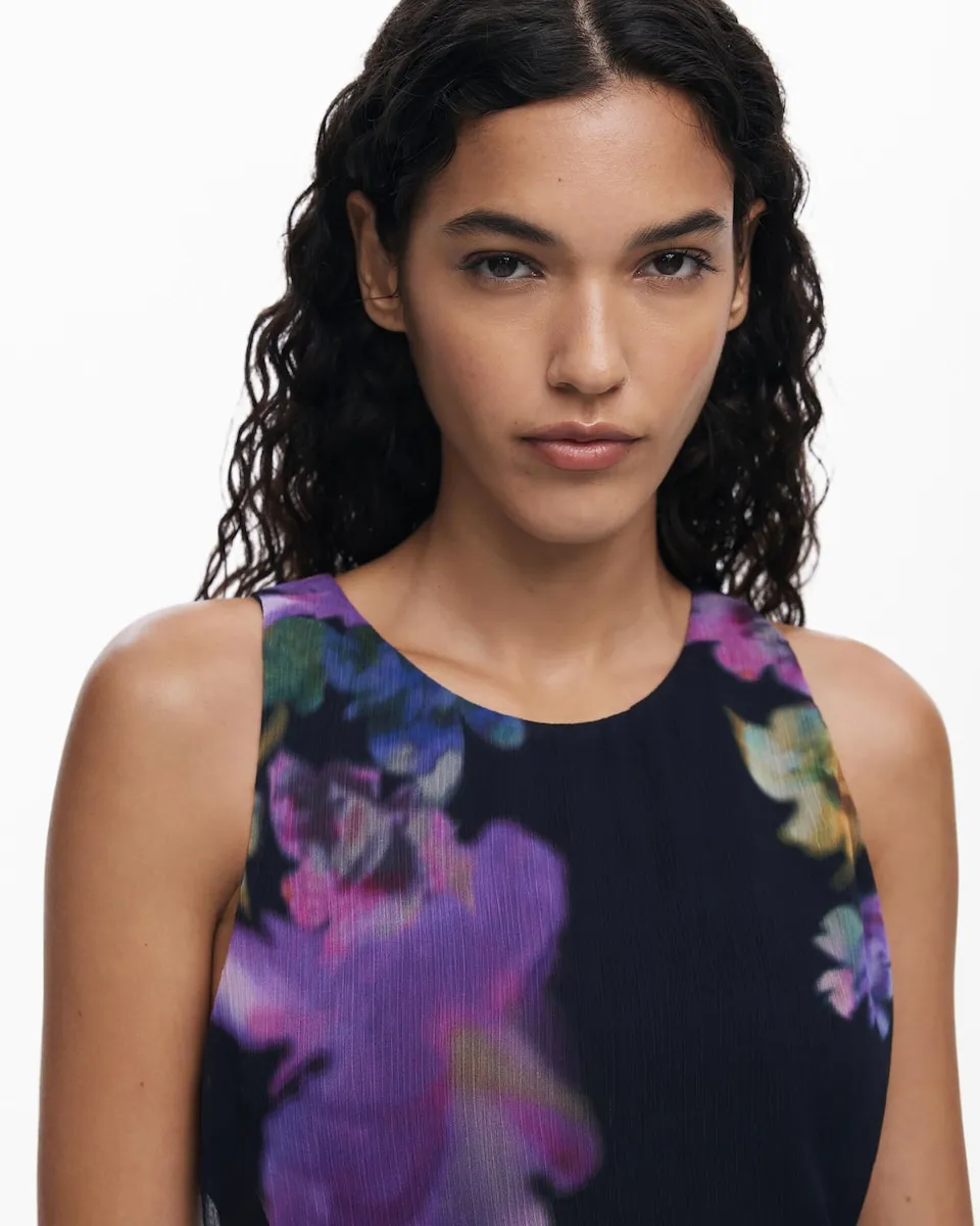 Миди-платье без рукавов, с круглым вырезом, с наложением тюля эффектом туники и цветочным принтом. Цветочный принт. Покрой: обычный. Без рукавов. Длина: миди. Застежка: на пуговицу. Переработанный полиэстер.