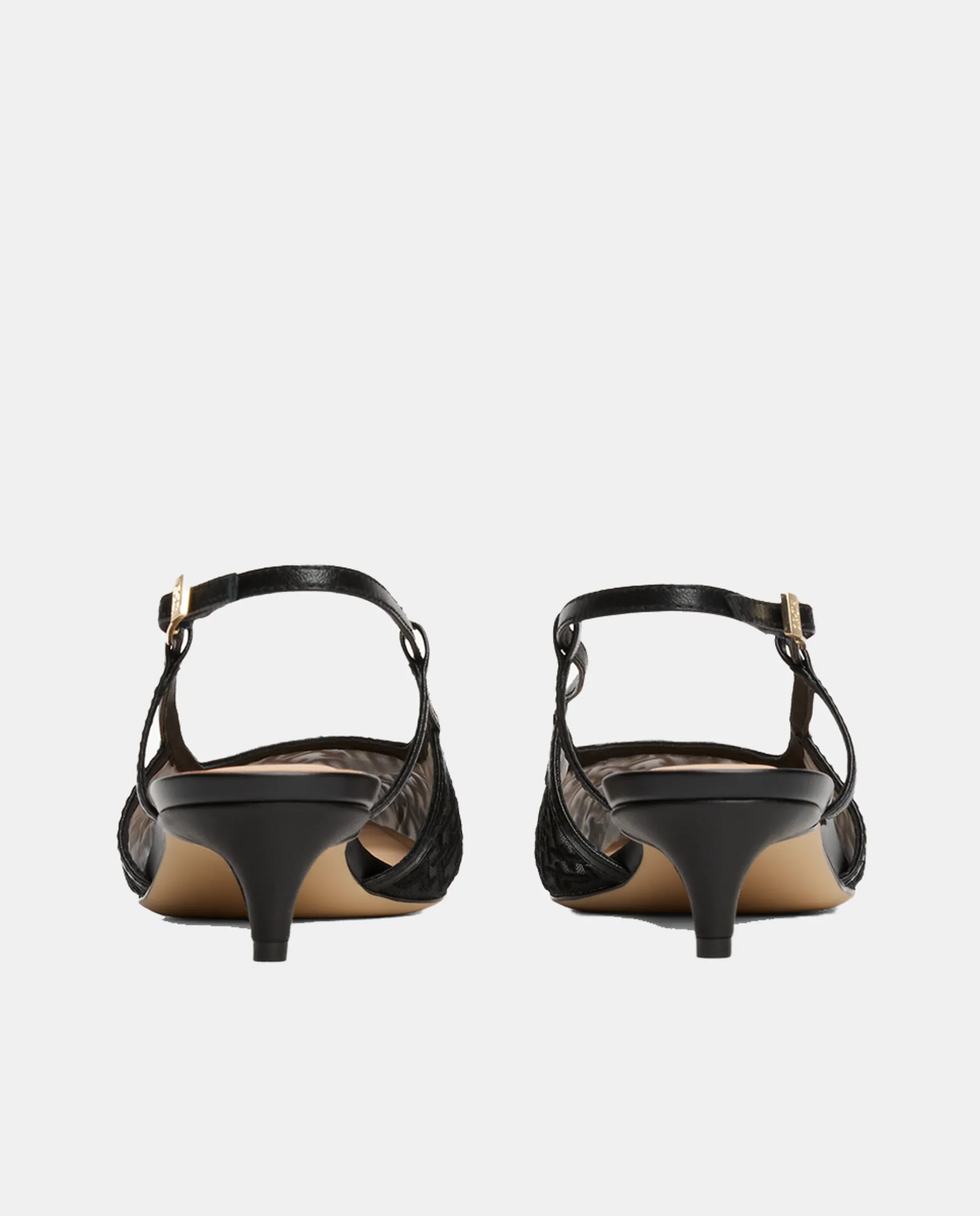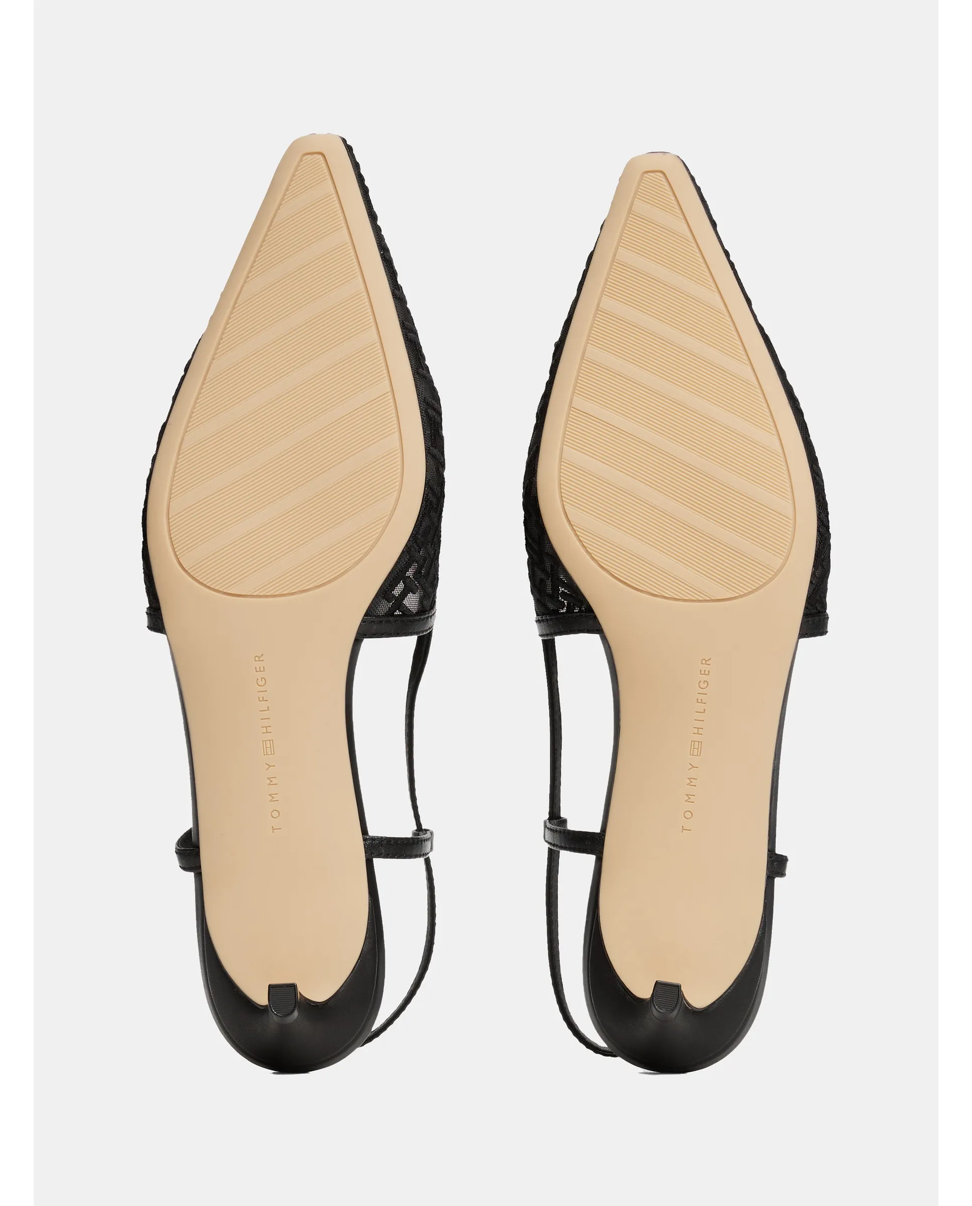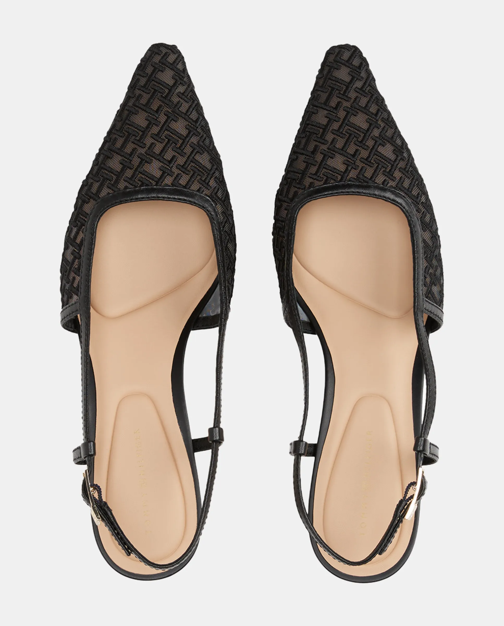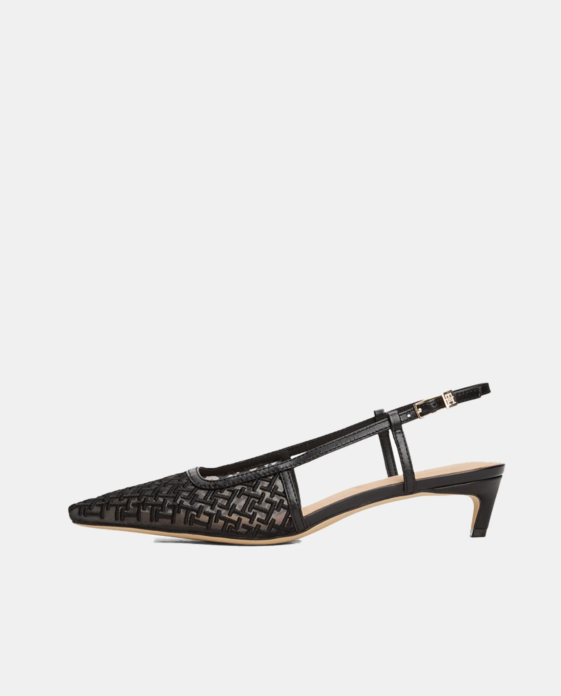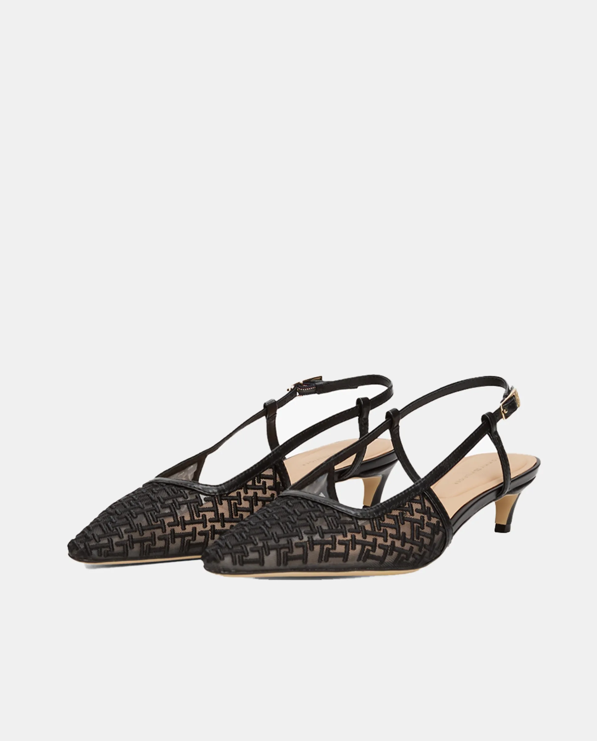 Туфли на каблуке Tommy Hilfiger из сетчатого материала с черным монограммой. Золотистый значок с логотипом TH сбоку.