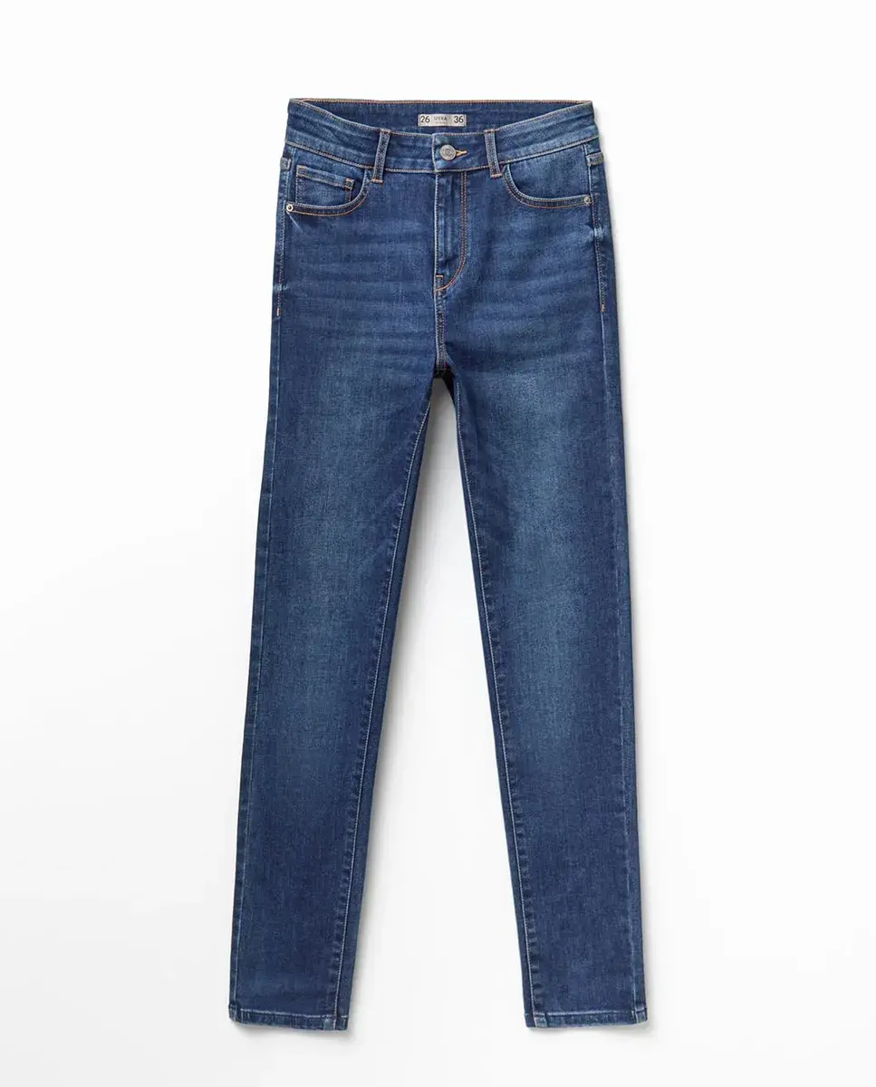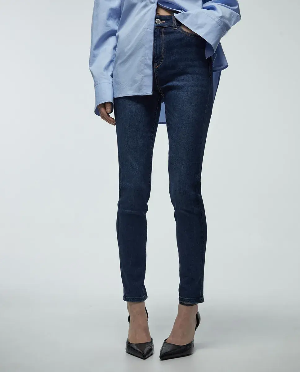 Джинсы скинни средней посадки темно-синего цвета. Закрываются на застежку-молнию и кнопку спереди.