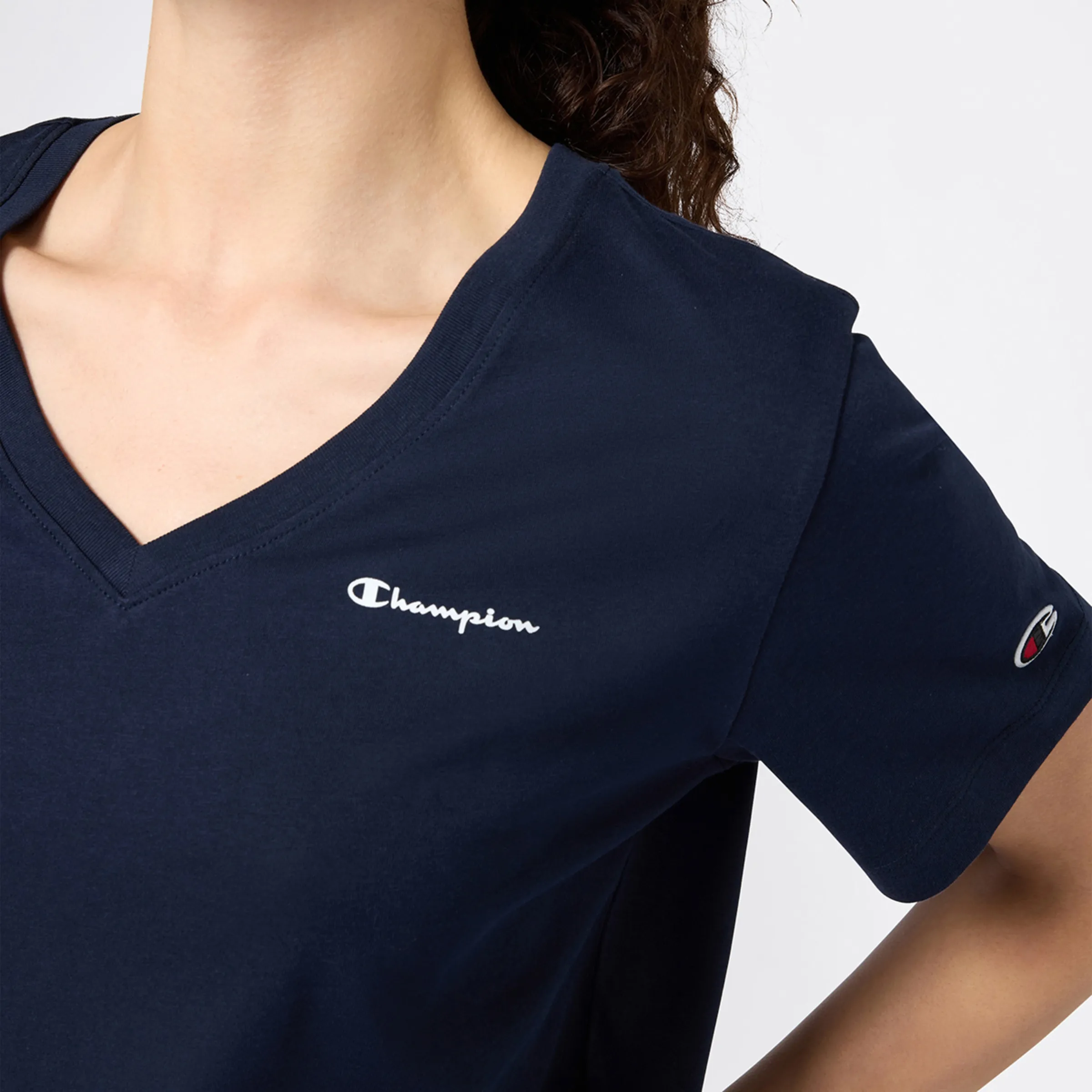 Классическая футболка линии спортивной одежды Champion. Короткие рукава, V-образный вырез и маленький сдержанный логотип. Из 100% хлопка, настоящая классика, которая легко комбинируется с вашим зимним гардеробом.