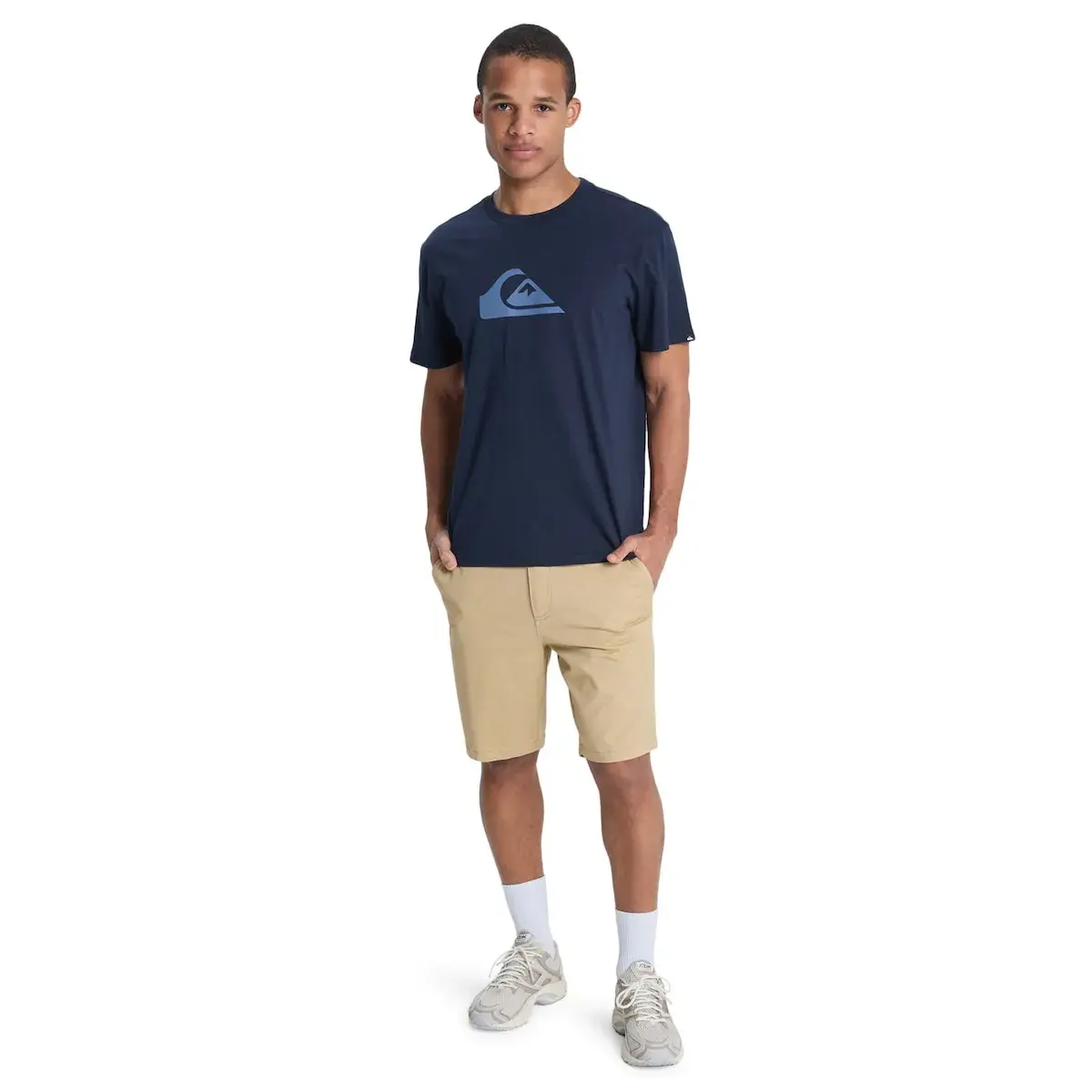 Футболка с коротким рукавом для мужчин. Характеристики включают: Ткань: обычный джерси из хлопка с переработанным хлопком, обычный крой, круглый вырез, сериграфия на груди и бирка Quiksilver на рукаве.