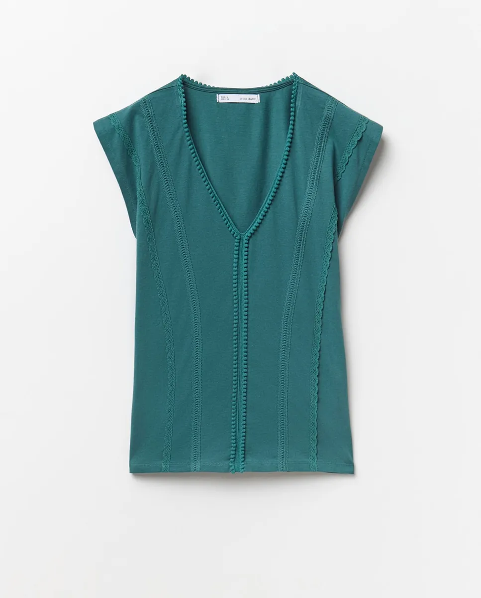 Футболка с коротким рукавом и V-образным вырезом с отделкой. 100% хлопок.