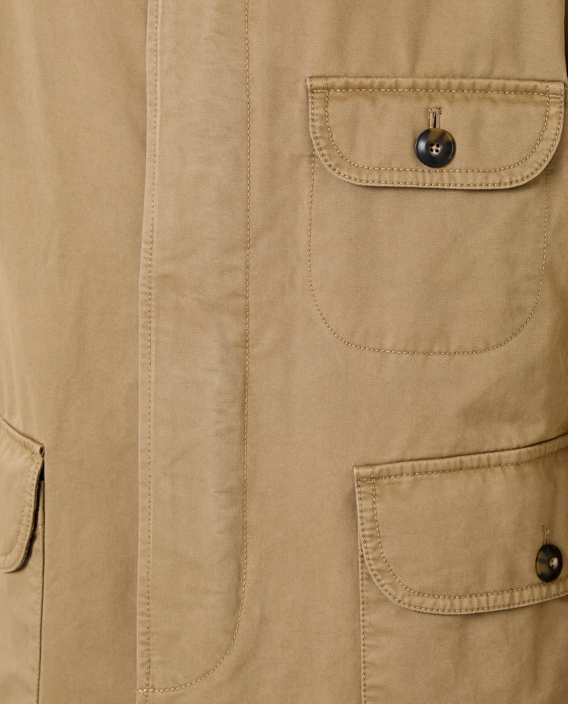 Мужская сафари-рубашка из стертого хлопкового саржа. Застежка изделия скрытая молния и пуговицы. Регулируемые манжеты на пуговицах. Детали из микро-вельвета на воротнике, манжетах и внутренней стороне карманов.