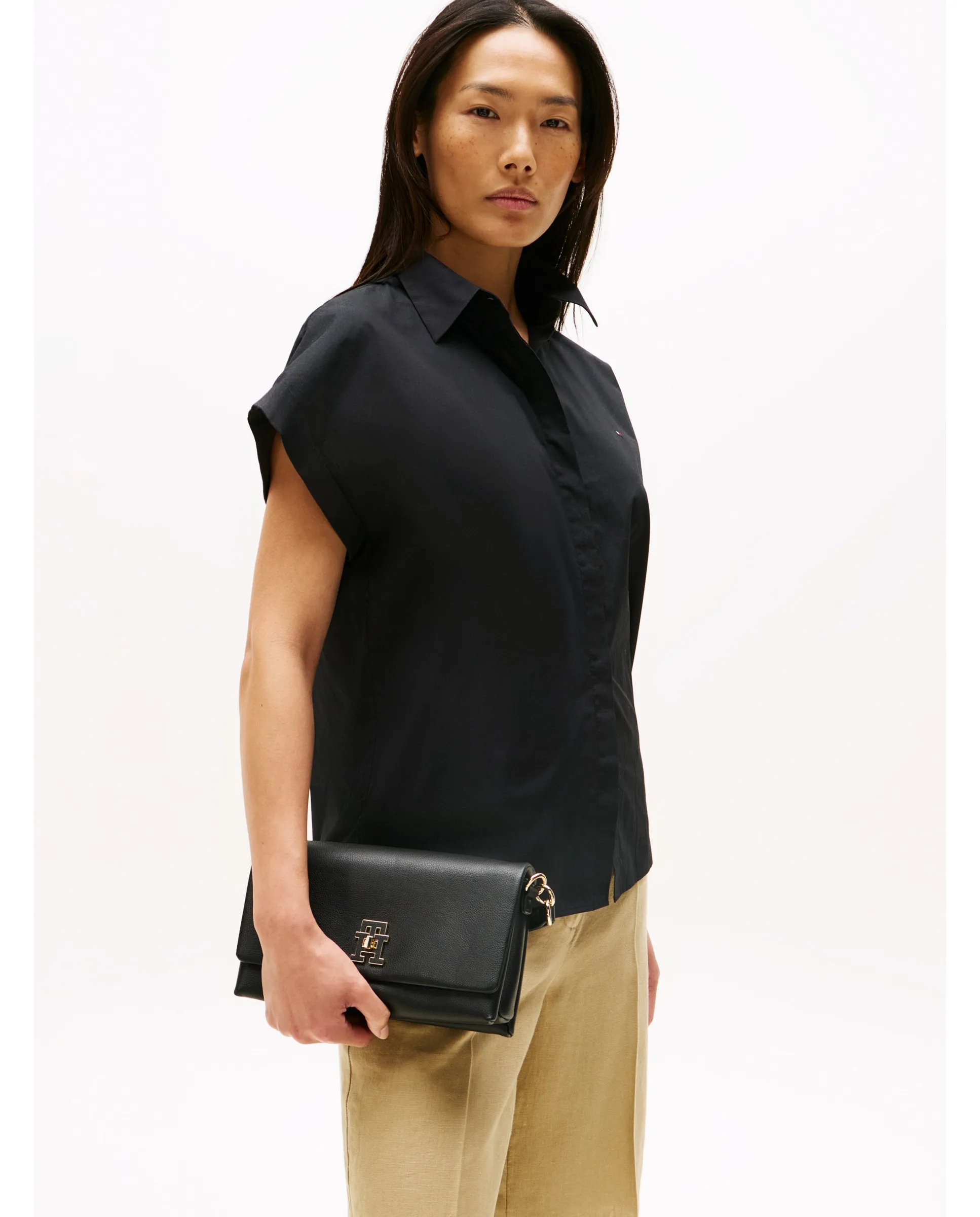 Женская сумка через плечо, изготовленная из переработанного полиэстера черного цвета. Дизайн с регулируемым ремнем, ручкой и застежкой с клапаном с логотипом Tommy Hilfiger.