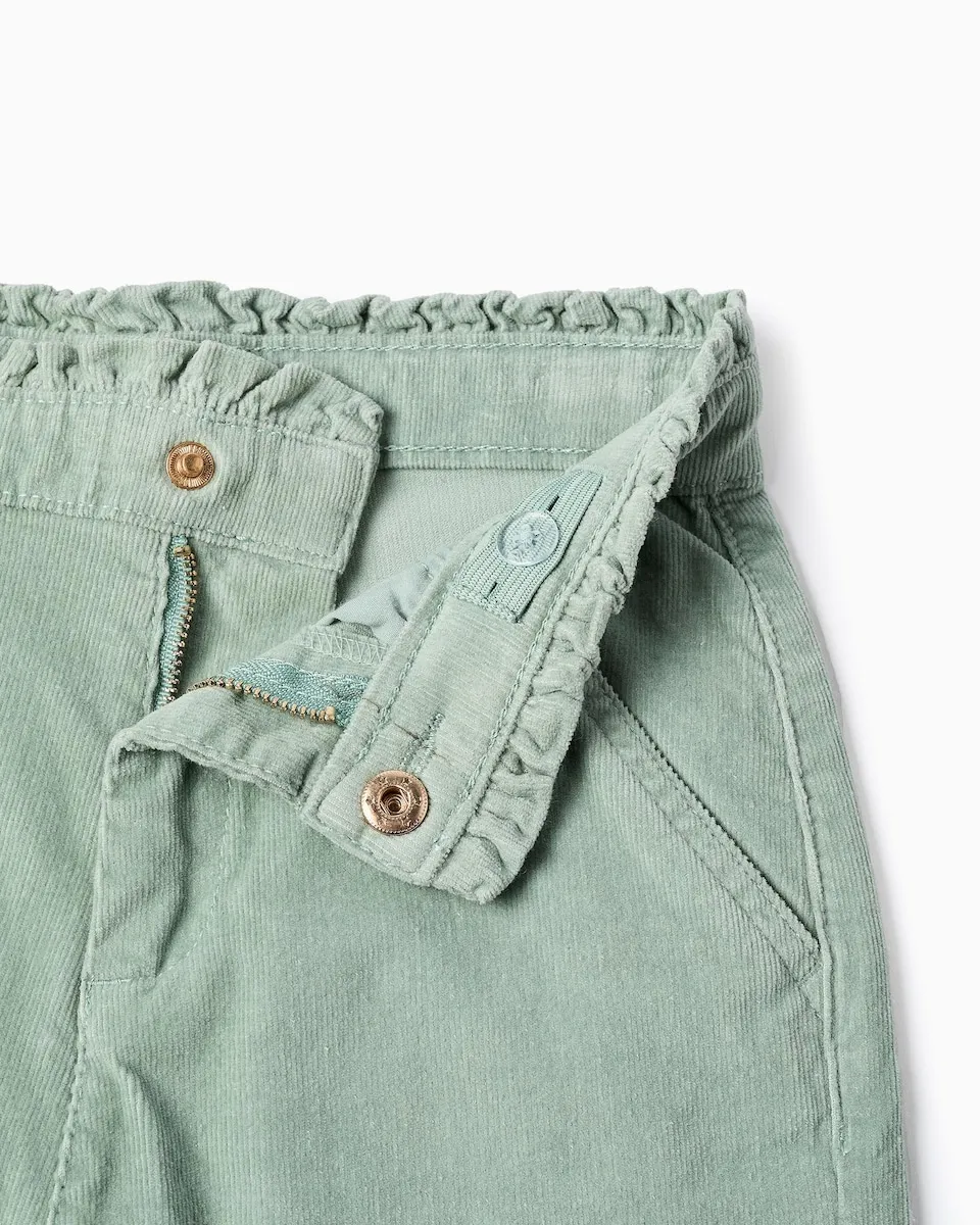Детские брюки из хлопкового вельвета с добавлением эластичных волокон для большей удобства и свободы движений. Модель с широкими штанинами. Четыре кармана. Пояс с рюшами, регулируемый внутри с помощью резинок и пуговиц. Для осенне-зимних образов, стильных и модных. Big Me: застегивается на кнопке под декоративной пуговицей до размера 8/9, чтобы облегчить процесс одевания и способствовать самостоятельности вашего ребенка.