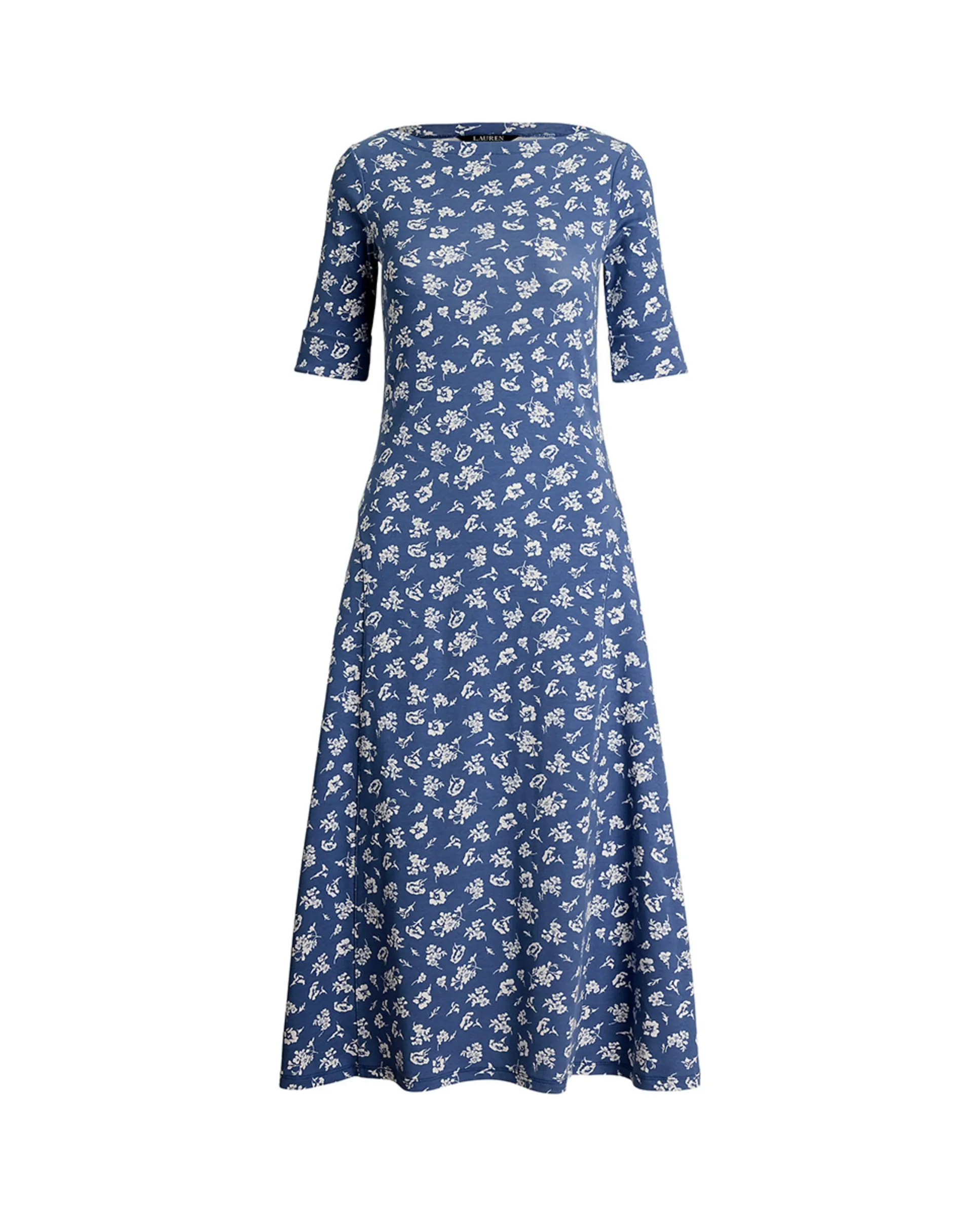 Это миди-платье с лодочным вырезом и рукавами до локтя, сшитое из дышащего эластичного хлопка с удобной посадкой и тактильными ощущениями, имеет цветочный рисунок.