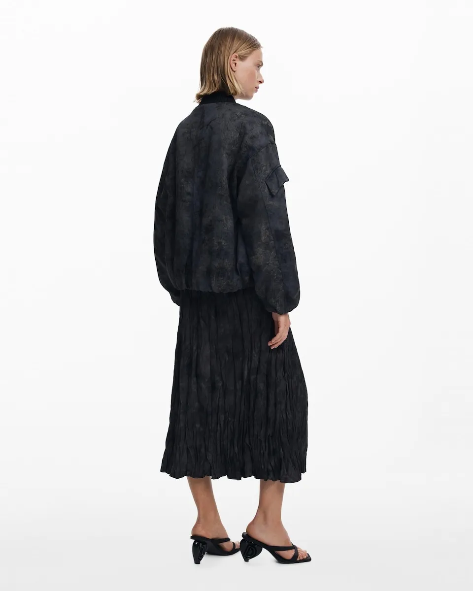 Миди юбка из эластичной вязки с складками и темным цветочным принтом в восточном стиле. Цветочный узор. Крой: Прямой. Длина: Миди. Эластичный пояс. Переработанный полиэстер.
