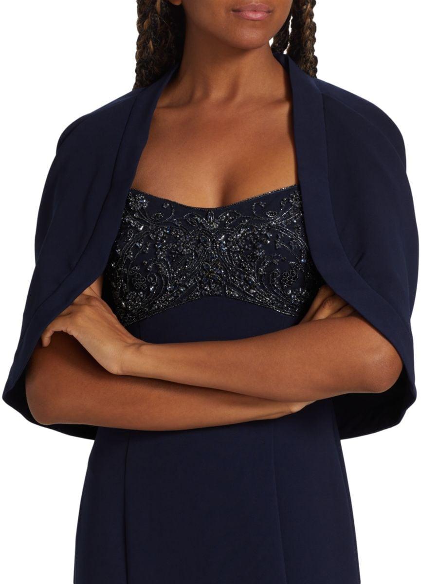 Платье-каплет Brigitta Capelet от THEIA выполнено из эластичного крепа для идеальной посадки. Прикрепленная накидка и расшитый бисером лиф изделия сочетают в себе вневременную элегантность с ноткой драматизма.