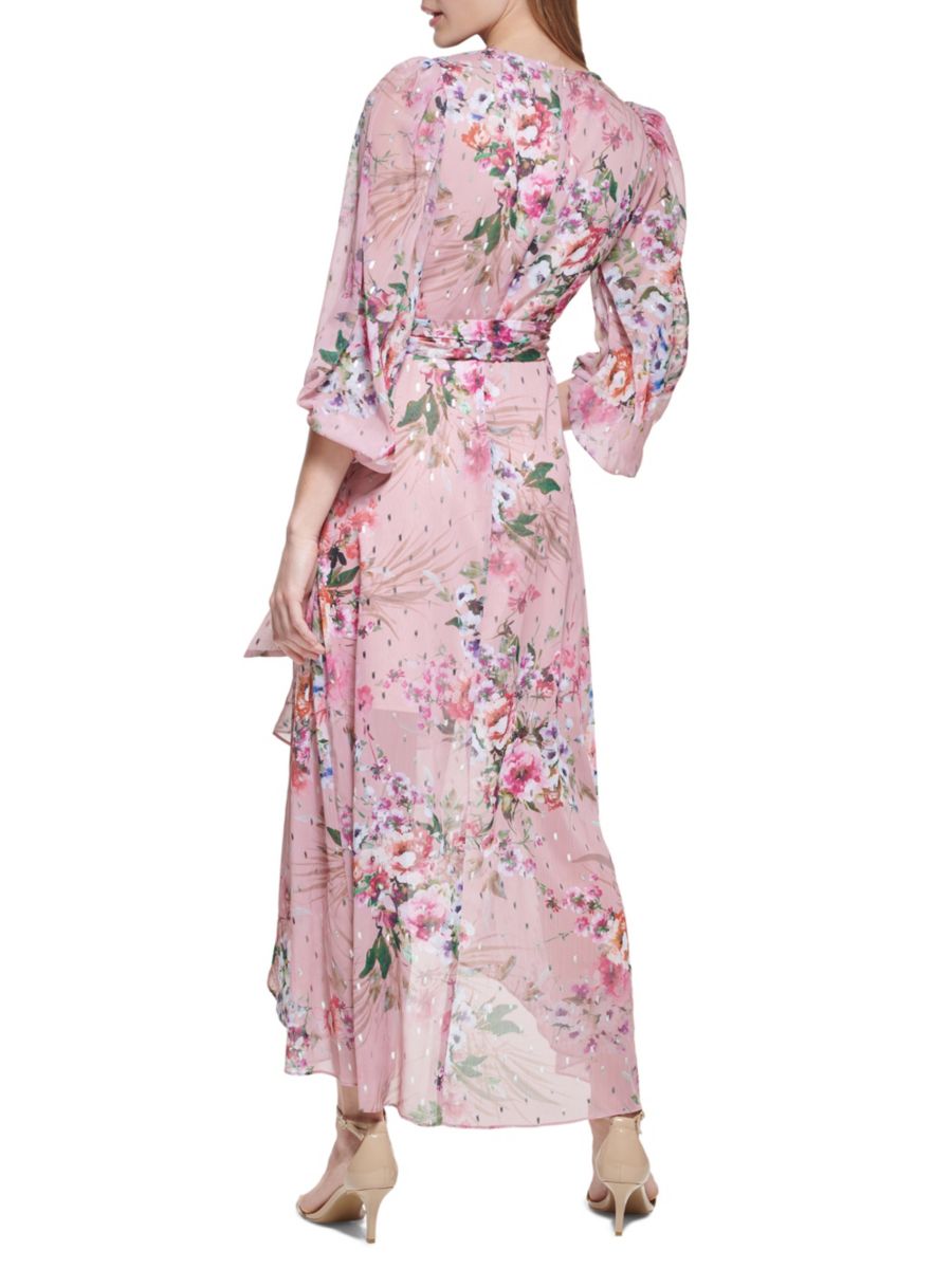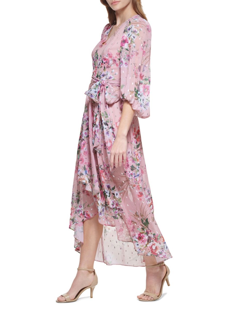 Это миди-платье от Eliza J отличается цветочным узором по всей поверхности, рукавами три четверти, поясом на талии и асимметричным подолом, который завершает его элегантный силуэт.