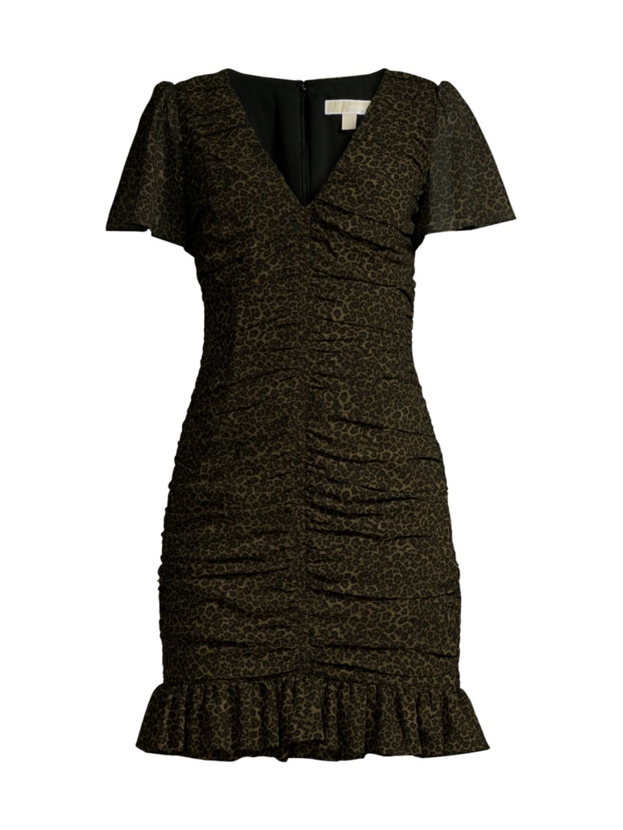 Мини-платье Savannah от MICHAEL Michael Kors имеет приталенный силуэт с рюшами, V-образным вырезом и короткими рукавами-крылышками. Оборка по низу завершает этот гепардовый принт.