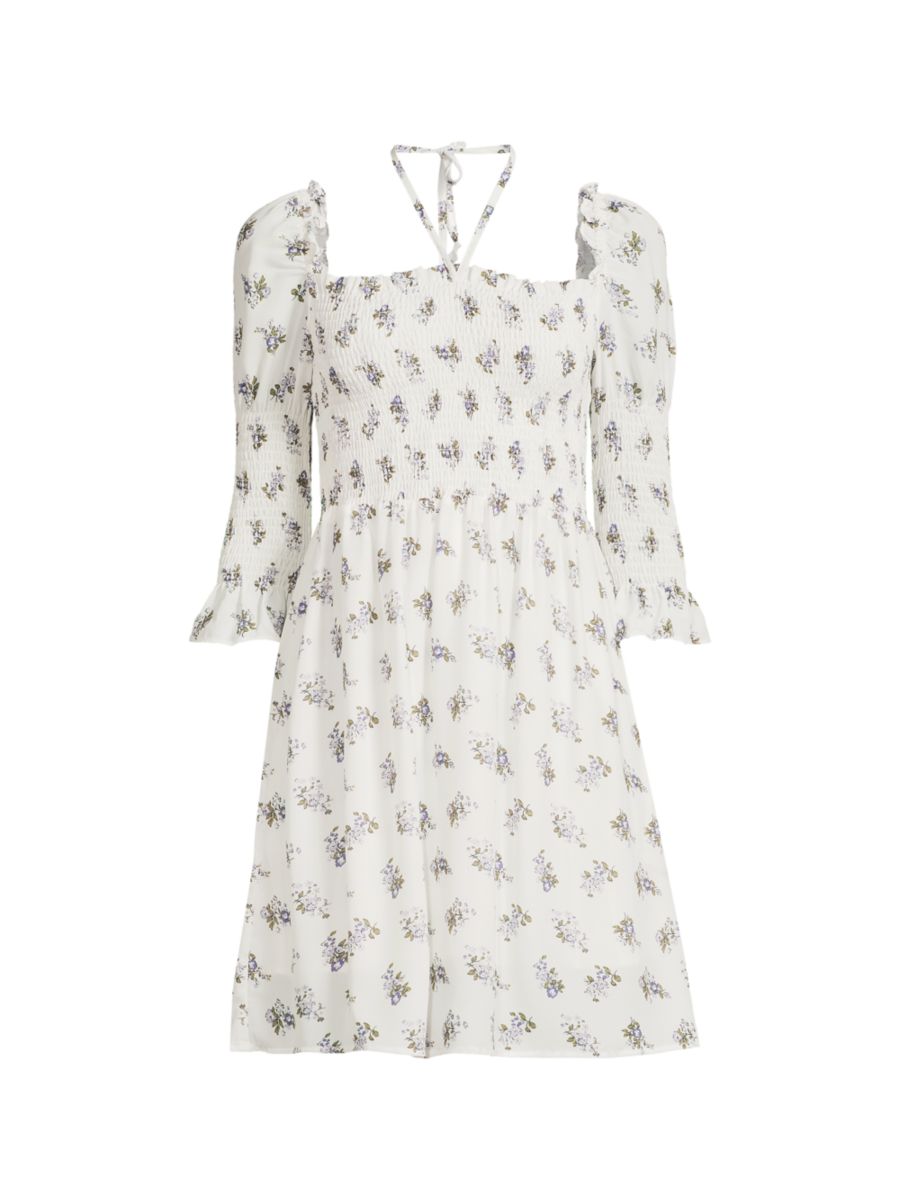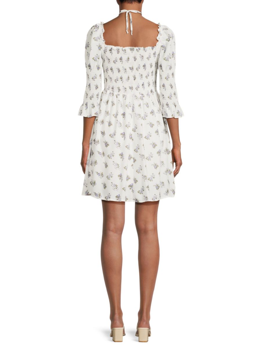 Это мини-платье с цветочным принтом и сборками от 70/21 имеет приталенный силуэт с расклешенной юбкой. Платье выполнено из струящегося материала с цветочным принтом, имеет квадратный вырез и расклешенные рукава три четверти. Дизайн дополнен сборками и завязкой на спине.
